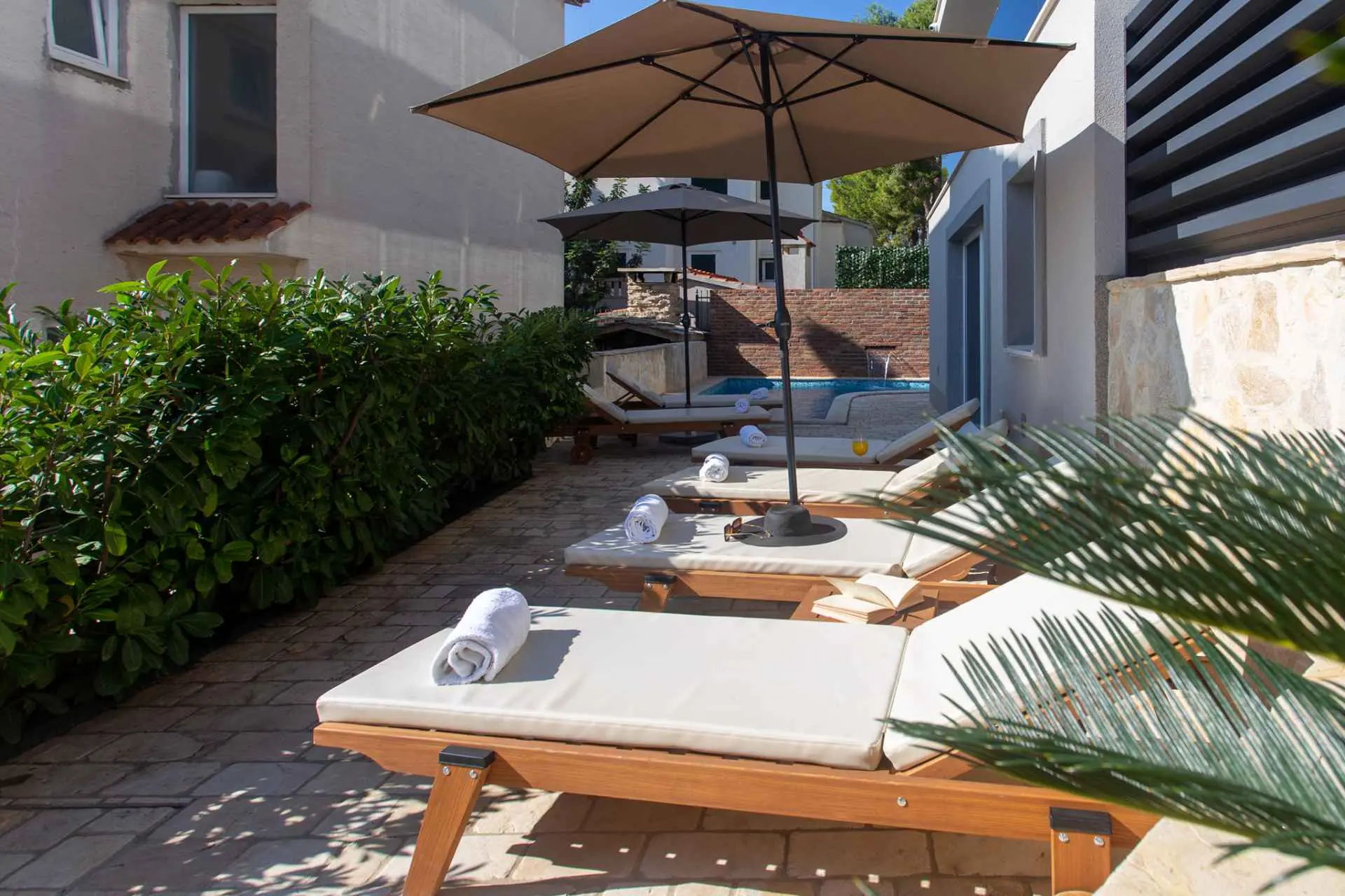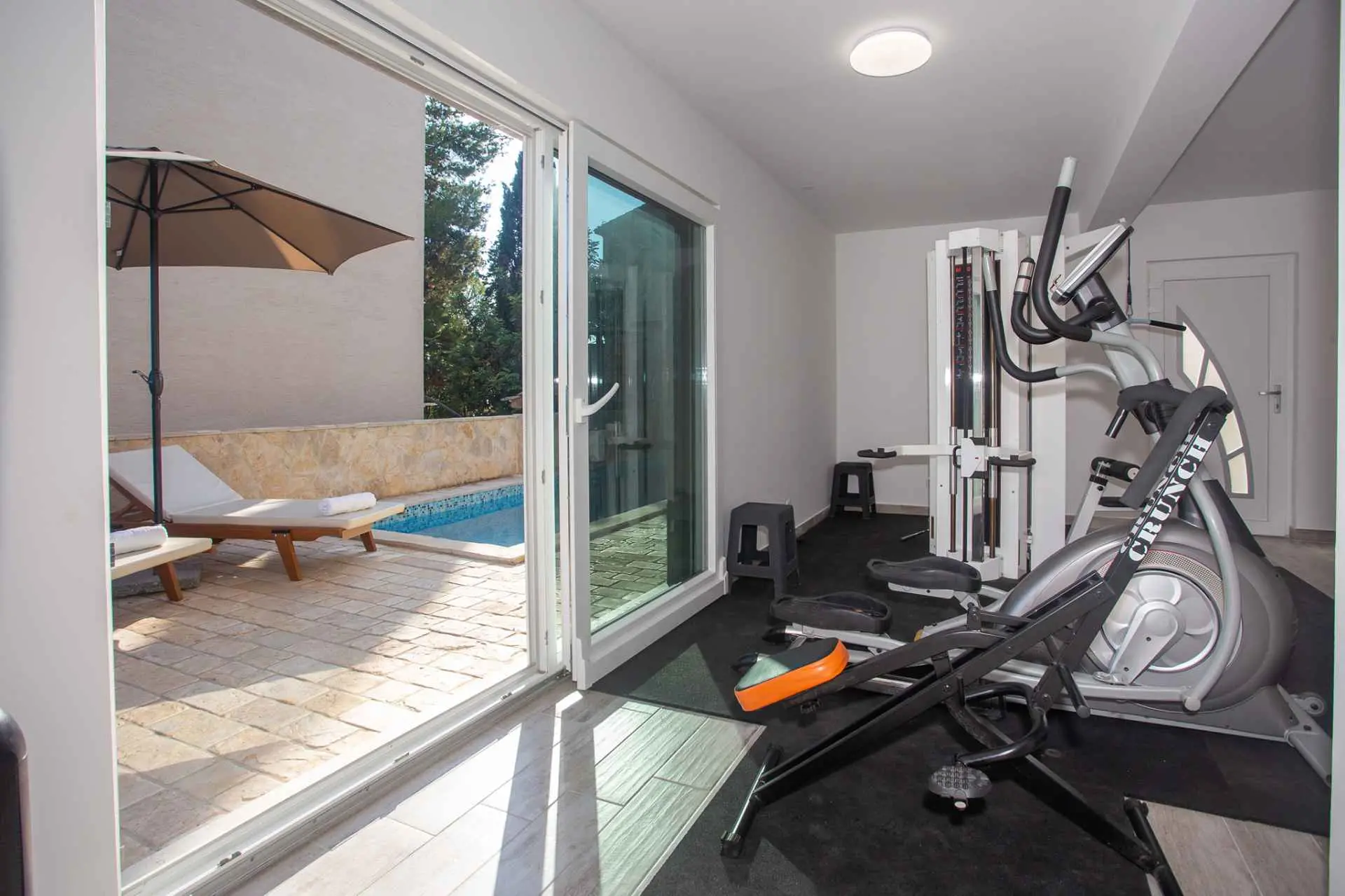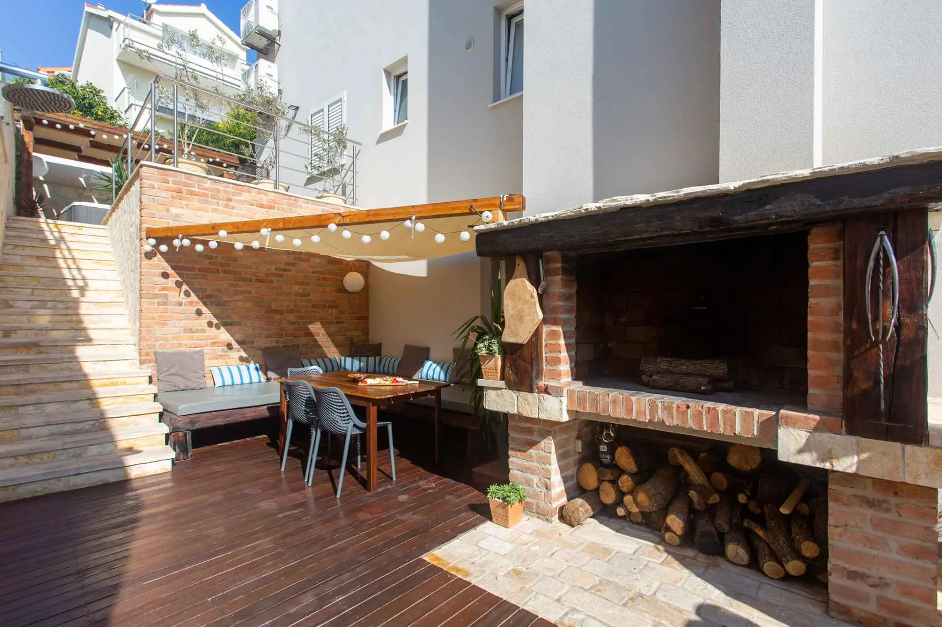 Ta wspaniała willa z odkrytym basenem z podgrzewaną wodą o powierzchni 40 m², prywatną siłownią i jacuzzi w Okrug Gornji na wyspie Čiovo oferuje idealne miejsce na wymarzone wakacje. Dom wakacyjny położony jest bezpośrednio nad morzem i jest odpowiedni dla maksymalnie 18 osób. Jest idealny dla 3 dużych rodzin lub kilku par: przyjemna atmosfera na 330 m² z sześcioma sypialniami, trzema łazienkami i trzema kuchniami z przytulnym salonem. W każdym apartamencie dwie dodatkowe osoby mogą spać na rozkładanej kanapie. Możesz cieszyć się wieloma szczęśliwymi godzinami na tarasie z widokiem na morze. Świetne wyposażenie obiecuje komfortowy wypoczynek. Wyposażony w duże naczynia kuchenne, lodówkę z zamrażalnikiem, zmywarkę, toster, ekspres do kawy, czajnik, telewizję satelitarną, klimatyzację, pralkę, parasole i leżaki. Ponadto goście mogą korzystać z bezpłatnego łącza internetowego, aby wysyłać e-maile do przyjaciół i rodziny w domu. Dom wakacyjny posiada bezpłatne prywatne miejsce parkingowe. Do Państwa dyspozycji jest miejsce na grilla, gdzie można przygotować pyszne posiłki. Ręczniki, pościel, ręczniki plażowe w cenie. Psów nie wolno zabierać ze sobą. Ta willa znajduje się w pięknym otoczeniu, w bezpośrednim sąsiedztwie betonowej plaży, 100 m. Piękne kamieniste plaże oddalone są o 300 m. Na pyszny posiłek wystarczy wybrać się na krótki spacer, 100 m. Bary, apteki, sklepy, kawiarnie, bary i wiele restauracji znajdują się w odległości krótkiego spaceru od domu wakacyjnego. Lotnisko w Splicie oddalone jest o 10 km. Wyspa Ciovo jest połączona mostem z lądem z miastem Trogir. Do kilku atrakcji regionu Trogir można szybko dojechać samochodem.