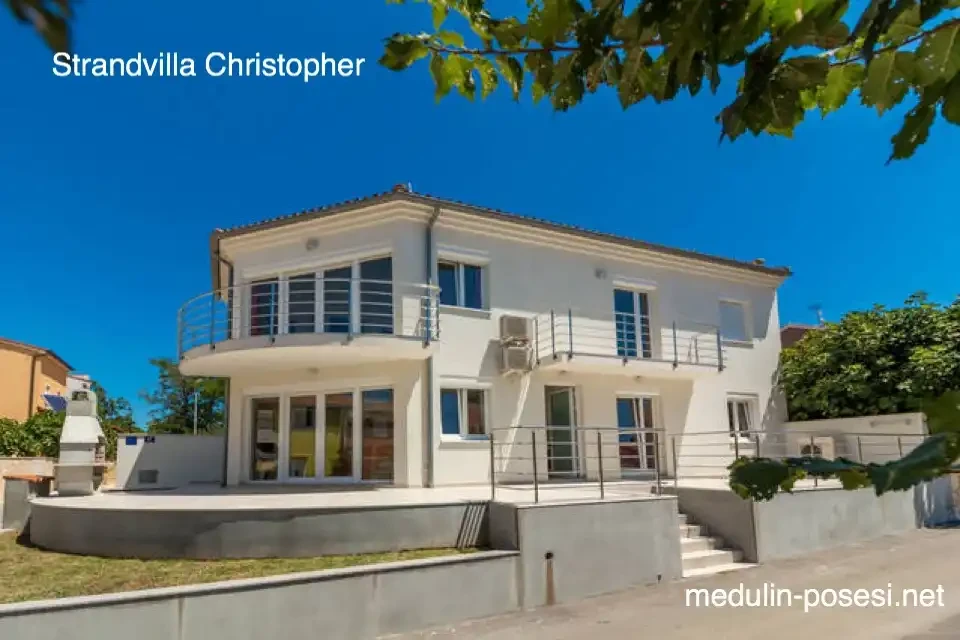 Willa architekta w pobliżu kąpieliska w chronionej zatoce Medulin-Posesi, dla 12 osób plus dziecko / łóżeczka dziecięce, z parkingiem, klimatyzacją, internetem, telewizją satelitarną, sejfem, dużym tarasem z grillem i kominkiem, balkonami i tarasem na dachu z fantastycznym panoramiczny widok na morze. Ponadto bezpłatne leżaki pod potężnymi sosnami na naszej prywatnej działce na jednej z najpiękniejszych plaż na Istrii. Oddzielne wejścia na piętro domu, łazienka i toaleta osobno, parter jest idealny dla rodzin z młodszymi dziećmi, piętro z mansardą i tarasem na dachu jest idealne dla rodzin ze starszymi dziećmi. Dlatego też możesz zarezerwować każde piętro domu jako własne mieszkanie wakacyjne. Wygodne duże podwójne łóżka z materacem sprężynowym, 2 w pełni wyposażone kuchnie, 2 duże pokoje dzienne z dużymi salonami, mansarda z podwójnym łóżkiem i tarasem na dachu z panoramicznym widokiem na morze, 2 balkony, 2 łazienki i 2 oddzielne toalety oferują optymalny komfort dla idealnego wakacje na plaży. Cotygodniowa zmiana pościeli. Ręczniki do rąk i pod prysznic, a także opłata klimatyczna, internet i klimatyzacja są wliczone w cenę. Ponadto oferujemy bezpłatne leżaki pod cienistymi sosnami na naszej prywatnej działce na plaży, tuż przy jednej z najpiękniejszych plaż na Istrii