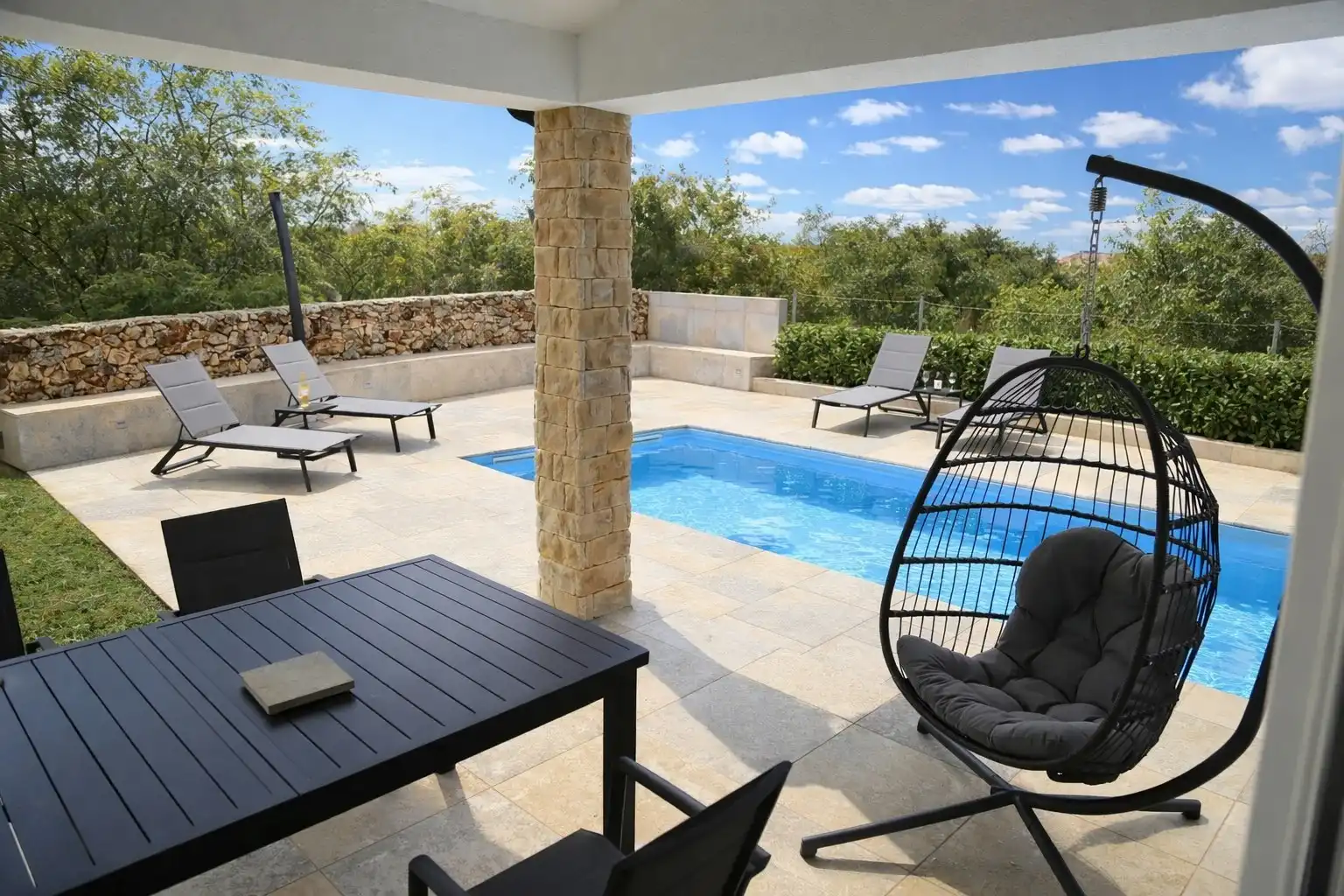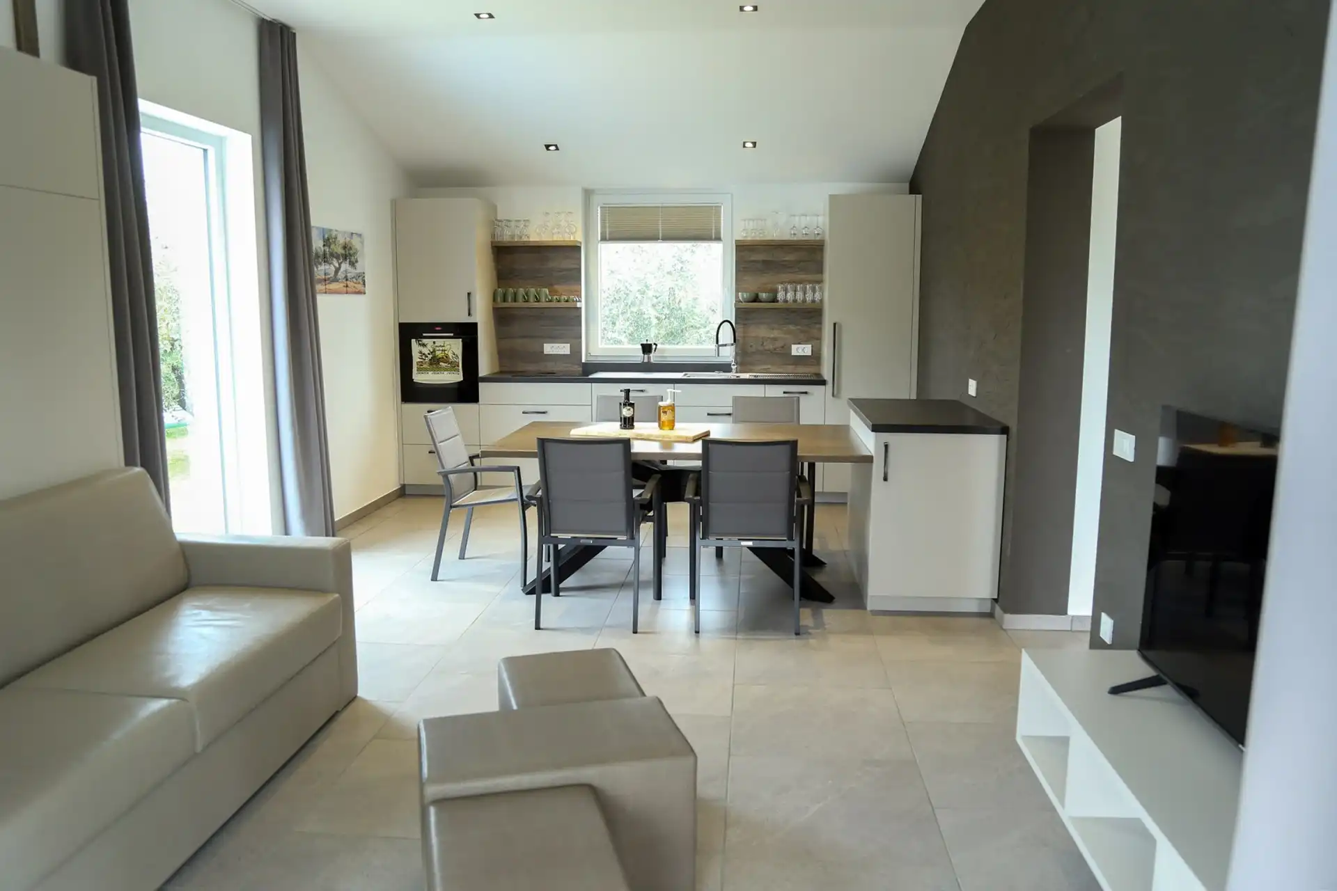 Ten nowoczesny apartament w Pomer to doskonały wybór na relaksujący, rodzinny wypoczynek. Z prywatnym basenem, przestronnym ogrodem i komfortowym, nowoczesnym wnętrzem, oferuje wszystko, czego potrzebujesz, aby naprawdę się zrelaksować i cieszyć wolnym czasem. Apartament może komfortowo pomieścić do 6 osób. Miejsca do spania obejmują: jedno łóżko king-size, dwa łóżka pojedyncze oraz łóżko składane w salonie. Kuchnia jest w pełni wyposażona i idealna do przygotowywania posiłków, zarówno na szybkie śniadanie, jak i na relaksującą kolację we dwoje. Na zewnątrz, w prywatnym ogrodzie, można korzystać z grilla, aby spędzać długie, relaksujące wieczory przy basenie. Rowery można bezpiecznie przechowywać w altanie ogrodowej. Apartament jest idealny dla rodzin lub przyjaciół szukających spokojnego pobytu blisko natury, a jednocześnie w pobliżu morza i lokalnych atrakcji. Basen jest dostępny od 1.04 do 31.10. Ogrzewanie basenu jest dostępne przed i po sezonie. Dopłata wynosi 20 EUR za dzień. Jeśli chcesz korzystać z ogrzewania basenu, poinformuj nas o tym z 5-dniowym wyprzedzeniem.