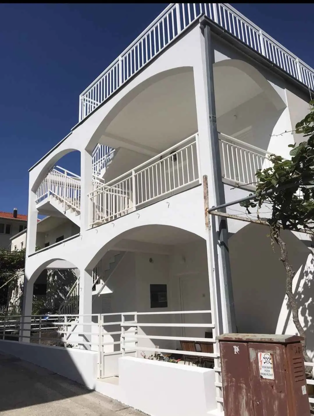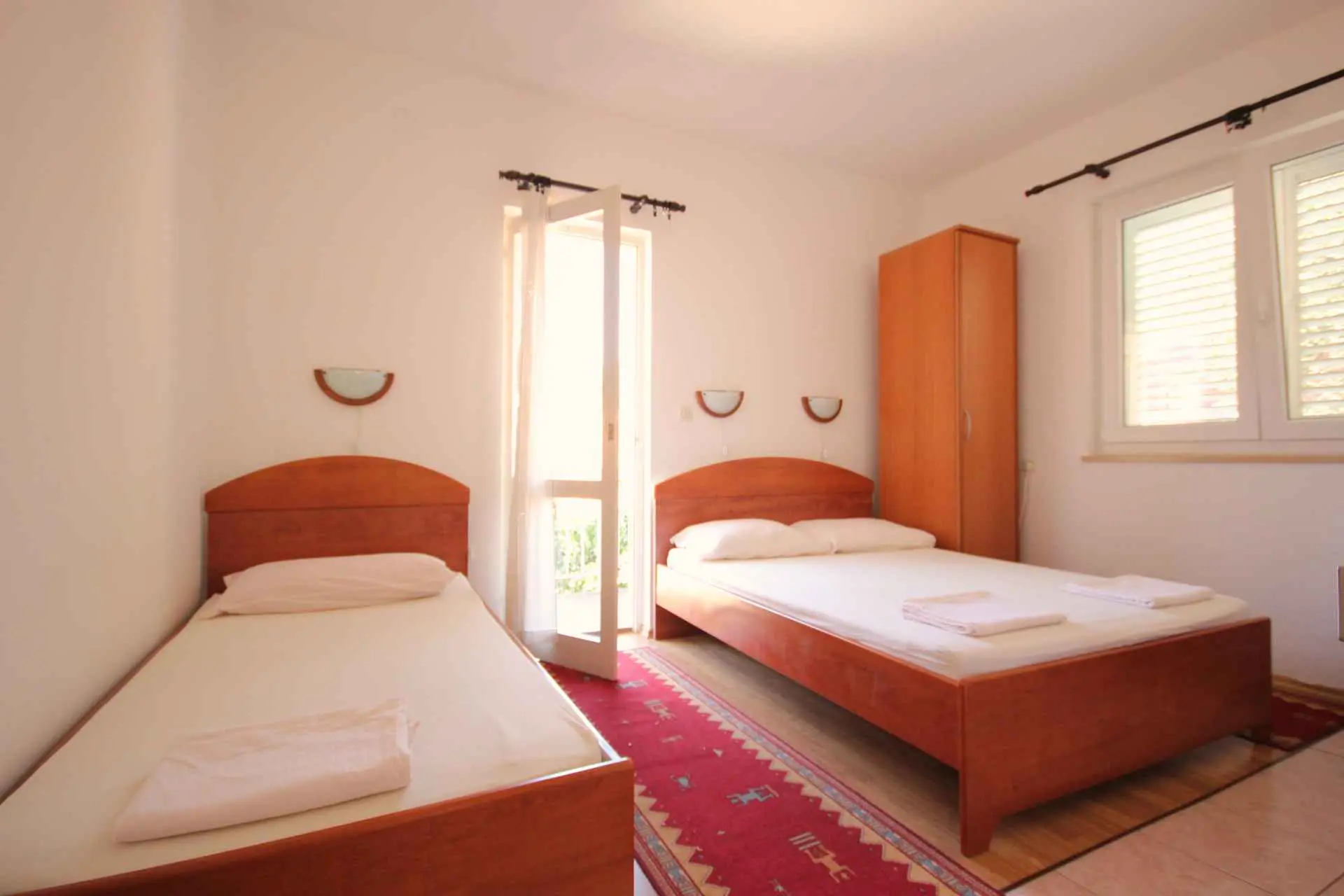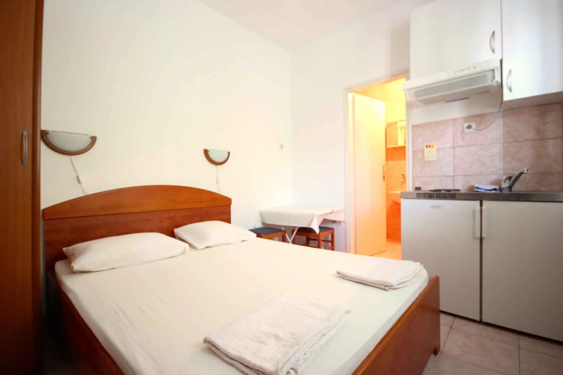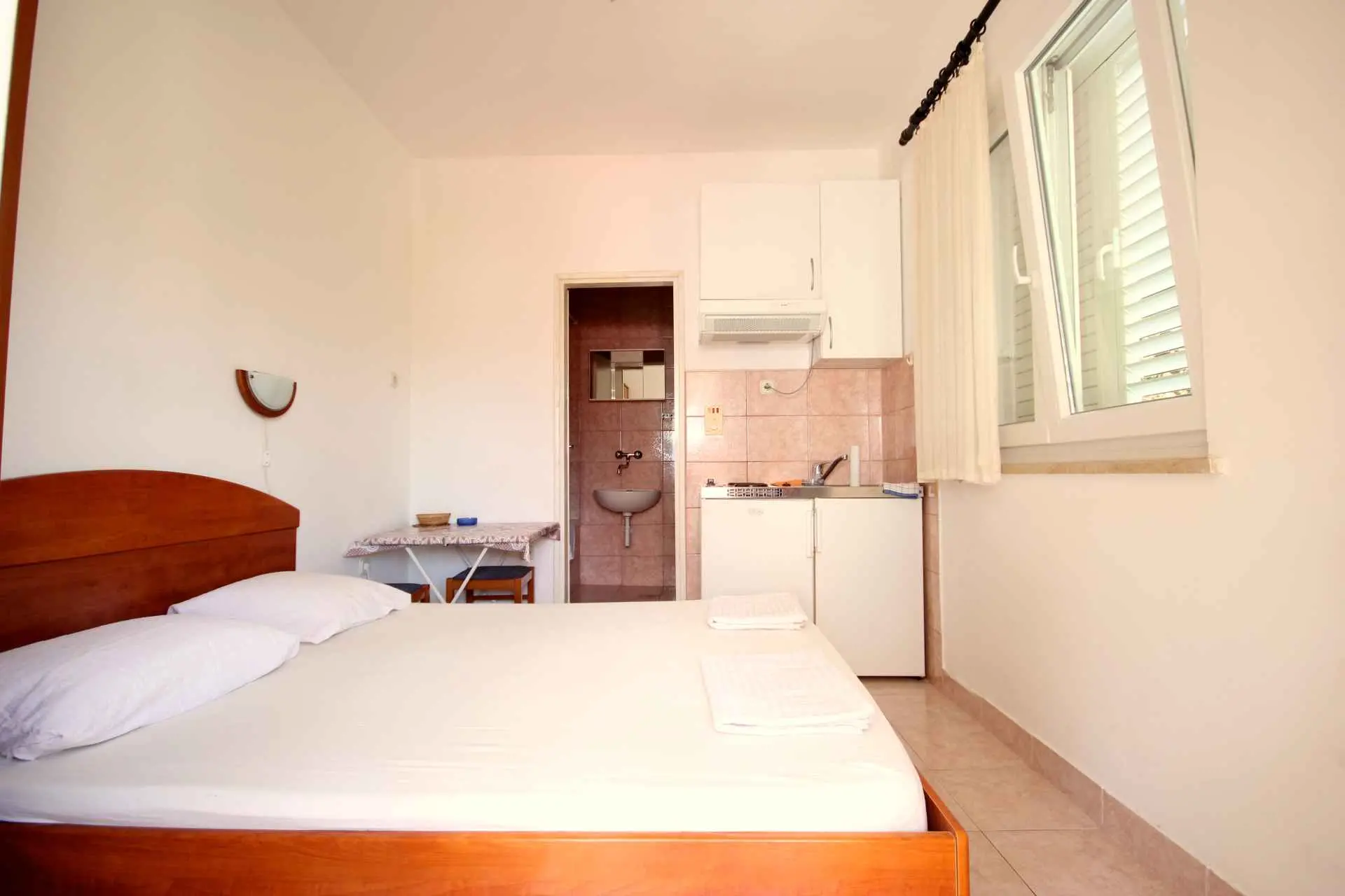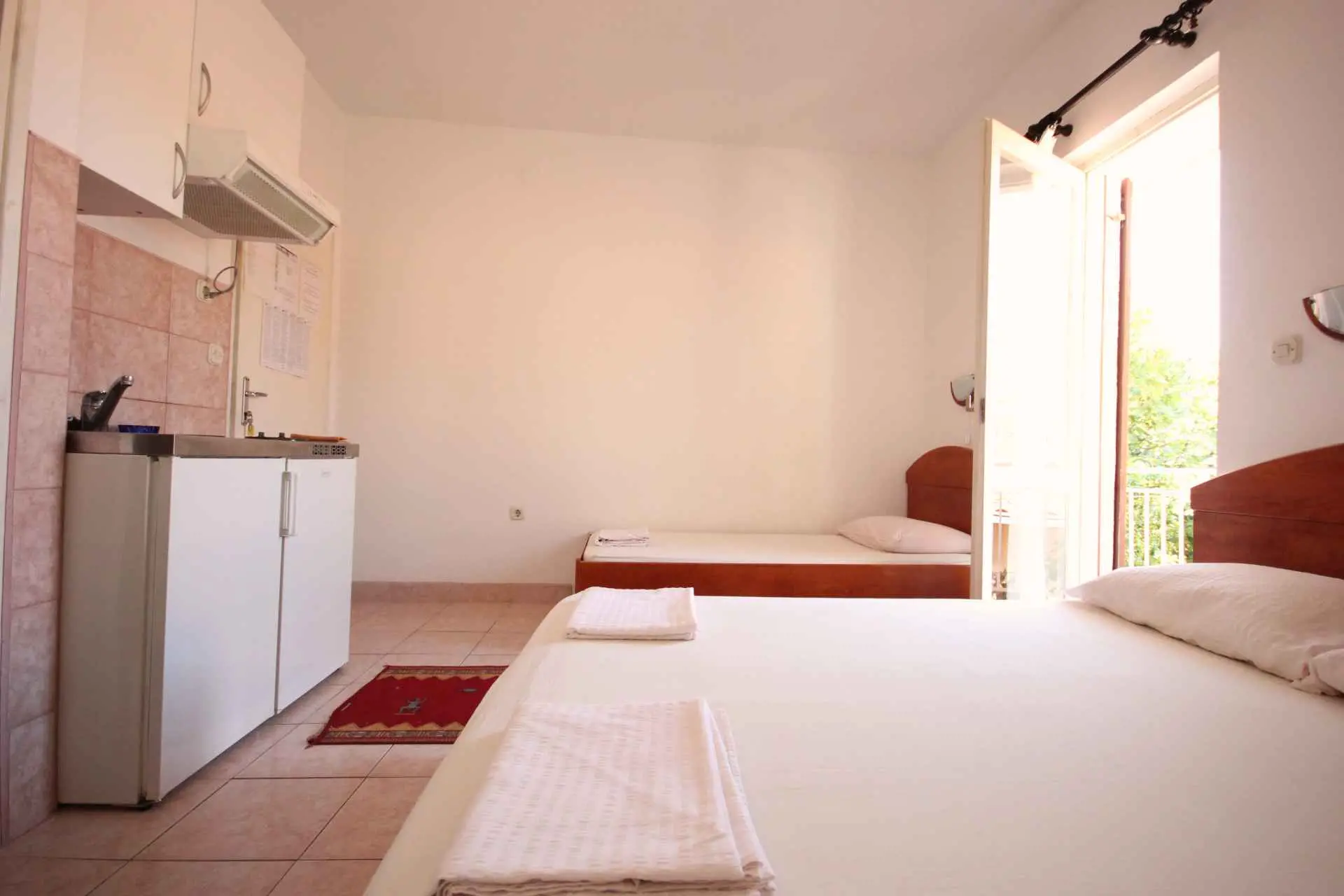 STUDIO APARTAMENTY do wynajęcia w kategorii "POKOJE ***", które zawierają oddzielną toaletę, mini kuchnię z lodówką i kuchenką oraz 3 łóżka (trzyosobowe) lub 2 łóżka (podwójne). Apartamenty znajdują się 100 m od plaży. W apartamentach znajdują się żyrandole z wentylatorami, ale wentylatory nie są wyposażone w klimatyzację. Apartamenty posiadają WiFi. Parking jest płatny osobno.