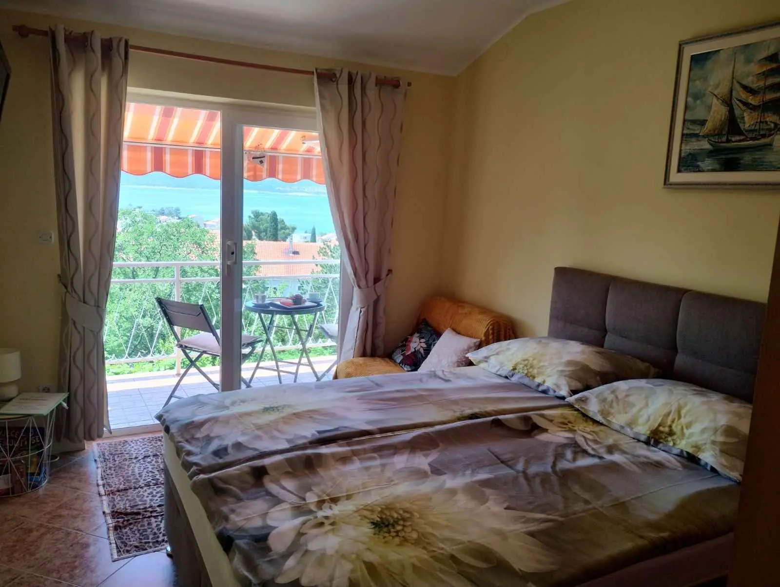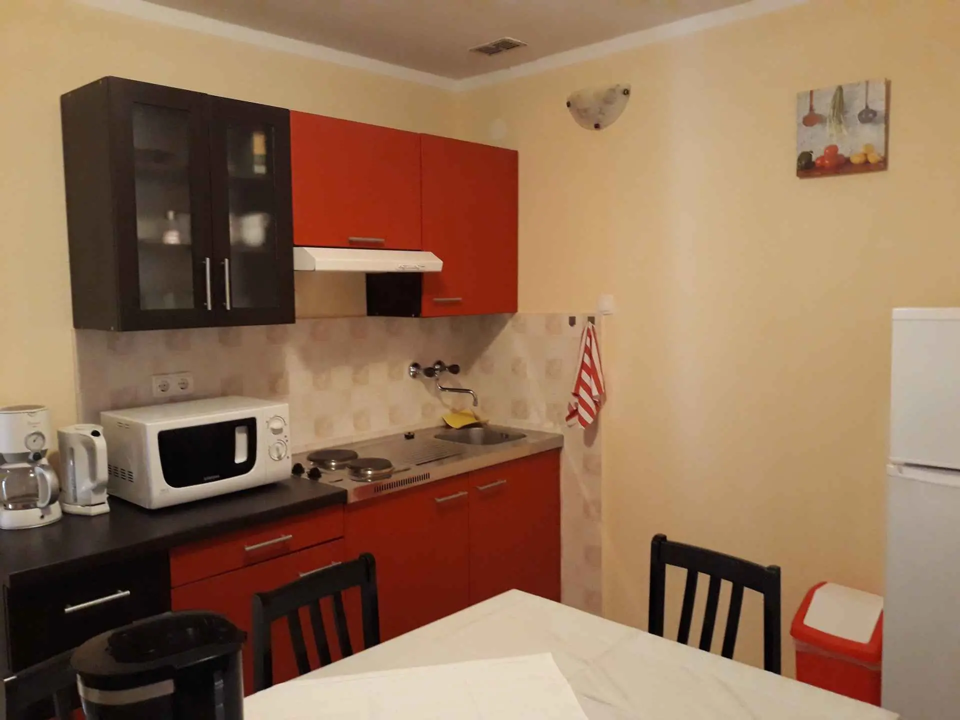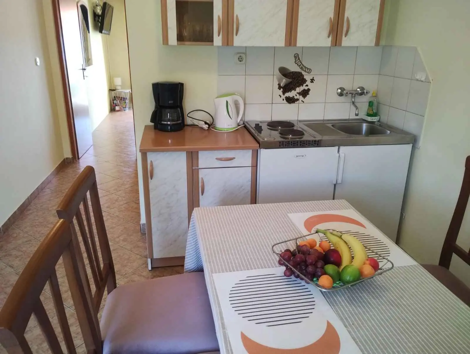 Apartament przeznaczony jest dla dwóch osób, z możliwością zakwaterowania jednego dziecka. Składa się z sypialni z łóżkiem małżeńskim i dodatkowym łóżkiem rozkładanym, kuchni z naczyniami i toaletą oraz łazienki. Posiada balkon z pięknym widokiem na morze. Znajduje się na 3. piętrze domu jednorodzinnego. Wyposażony jest w telewizję satelitarną, internet i klimatyzację. Parking znajduje się na podwórku domu. Wszystkie udogodnienia – restauracje, poczta i apteka – znajdują się w odległości 400 metrów. Plaża oddalona jest o 450-500 metrów – zaledwie 10 minut spacerem.