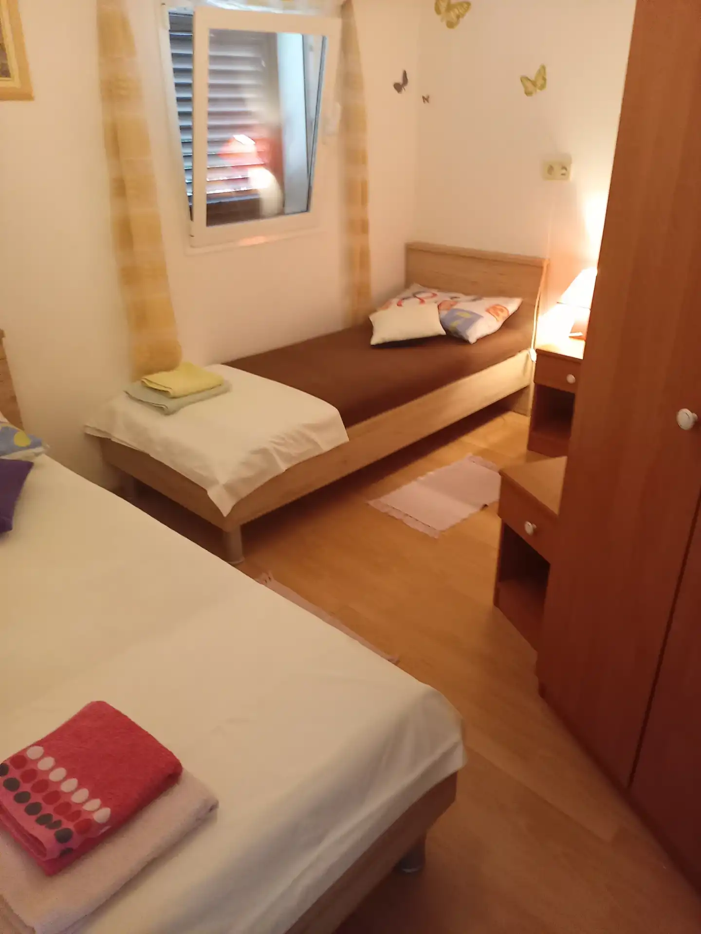 CHORWACJA-DALMACJA-SVETI PETAR -Zadar-okolice, małe miasteczko Sveti Petar, 5 km od Filipa Jakova, 8 km do Biogradu na moru. 100 m do morza i plaży. Oferujemy 2 oddzielne mieszkania na pierwszym piętrze domu z tarasami. Dom znajduje się przy bocznej ulicy, osobne wejście do mieszkań. Mieszkanie 4+1 = 2 oddzielne sypialnie, salon z jadalnią i kuchnią, przedpokój, pomieszczenie gospodarcze, łazienka. Apartament 2 + 1 = 1 oddzielna sypialnia, kuchnia + salon, łazienka. W przypadku dłuższych pobytów, korzystanie z pralki dostępne. Zadaszone tarasy w cieniu zieleni + dodatkowy taras na dachu do wypoczynku i opalania, z widokiem na morze, małe wysepki i wyspę Pasman. Specjalnie ogrodzony i zadaszony parking oraz dom do przechowywania rowerów. Sveti Petar to mała miejscowość nad morzem, a lokalna szkoła i plac zabaw dla dzieci w odległości 100 m. Wszędzie są plaże, żwirowe, kamieniste, więc każdy może znaleźć coś dla siebie, co mu się podoba (niedaleko znajdują się słynne i atrakcyjne plaże Dražica, Soline, Crvena Luka...). W pobliżu wszystkich większych miast, Parków Narodowych ... Krka, Ścieżka rowerowa jeziora Vrana, Wyspy Kornati, Fan Park Mirnovec. Cena uzależniona od ilości osób i terminu przyjazdu (40 € -70 €) Przyjedź do Sveti Petar, do Apartamentu Danicako, gdzie przywitają Cię sympatyczni gospodarze!
