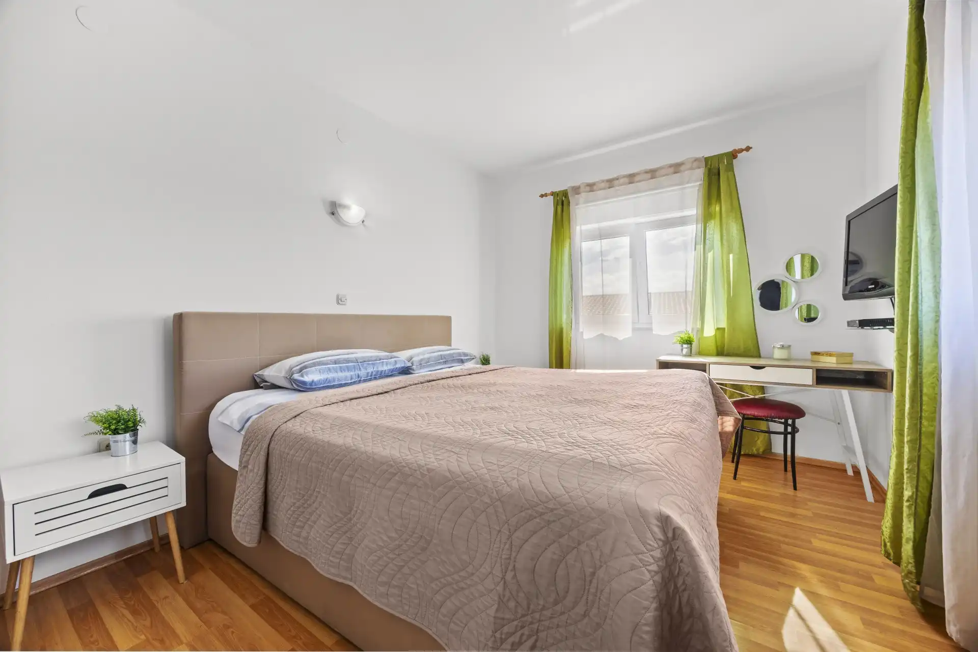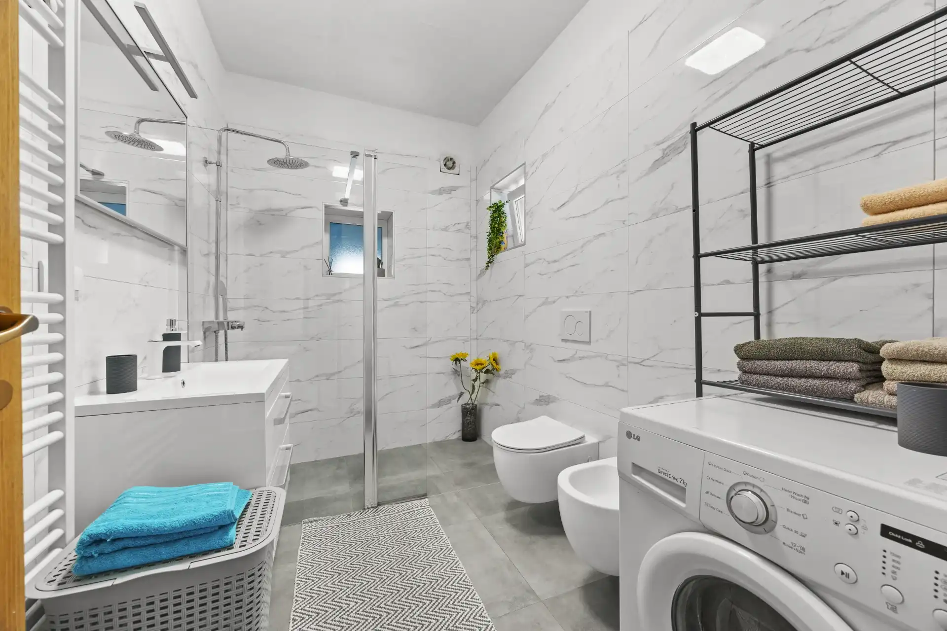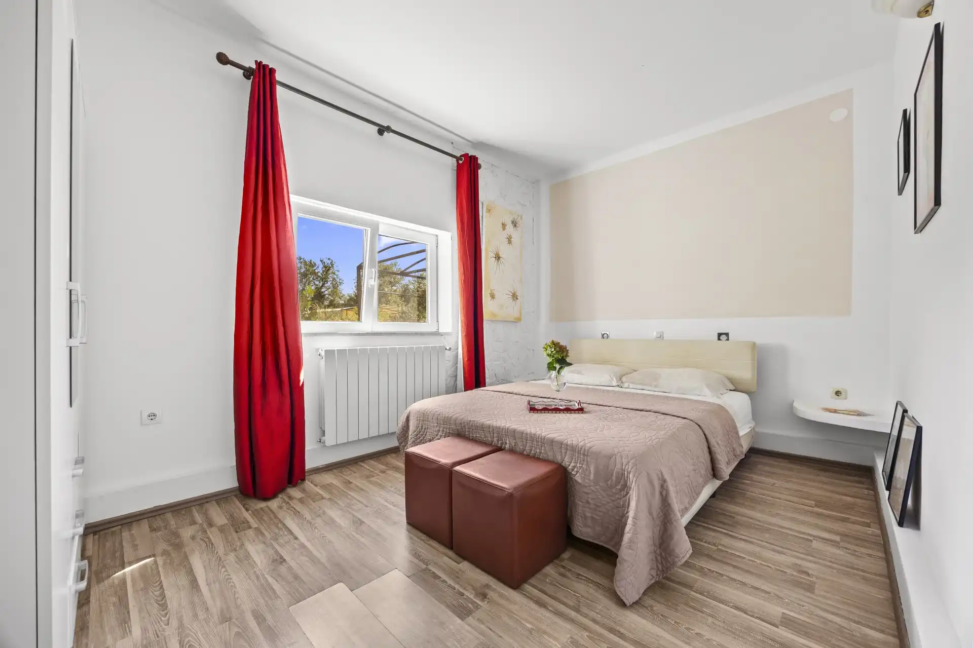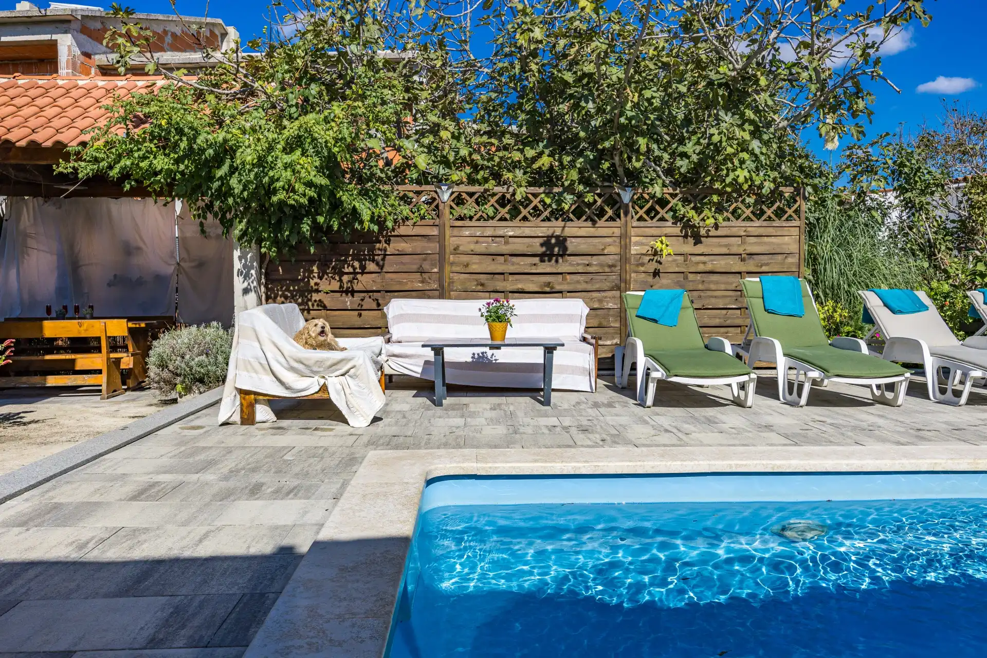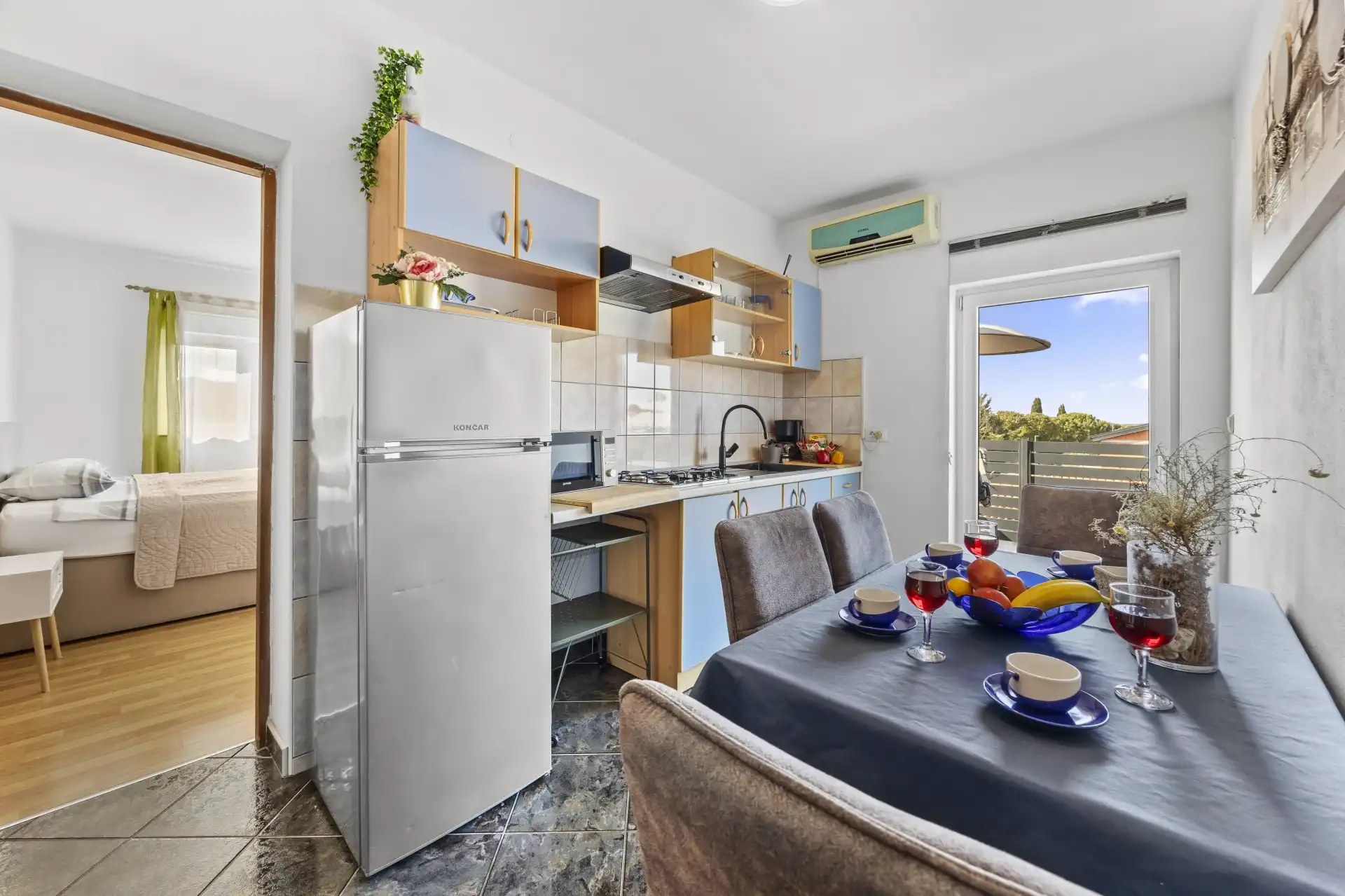 Odkryj urokliwy azyl w sercu Fažany. Ten przestronny dom oferuje apartamenty z dwiema lub trzema sypialniami. To idealne miejsce dla par, rodzin i grup przyjaciół poszukujących niezapomnianych wakacji w Chorwacji. Starannie zaprojektowane apartamenty oferują zakwaterowanie dla 10 osób dorosłych i dwójki dzieci. Apartament z trzema sypialniami może pomieścić do 6 osób dorosłych i dwójkę dzieci, a apartament z dwiema sypialniami – dla 4 osób dorosłych. Apartamenty oferują komfortową i przytulną przestrzeń z nowoczesnymi udogodnieniami oraz piękny wspólny basen. Wejdź do pięknie urządzonego salonu z drewnianym parkietem i marmurową podłogą, tworząc elegancką i ciepłą atmosferę. Apartamenty oferują w pełni wyposażoną kuchnię ze wszystkimi niezbędnymi sprzętami. Ciesz się wspólnymi posiłkami przy dedykowanym stole lub zrelaksuj się w wygodnej części wypoczynkowej ze smart TV. Prawdziwą atrakcją są przestrzenie zewnętrzne, z umeblowanym tarasem z grillem i meblami ogrodowymi, idealnym do spożywania posiłków na świeżym powietrzu i relaksu. Leżaki zachęcają do rozkoszowania się śródziemnomorskim słońcem, a wspólny basen oferuje orzeźwiający relaks w ciepłe dni. Obiekt oferuje również praktyczne udogodnienia, takie jak parking dla rowerów i prysznic na świeżym powietrzu. Apartament jest klimatyzowany i oferuje bezpłatne WiFi, co czyni go idealnym miejscem zarówno dla osób podróżujących służbowo, jak i dla przyjemności. Akceptujemy również do dwóch futrzanych zwierząt domowych za dodatkową opłatą 7 euro za zwierzę za noc (płatną gotówką po przyjeździe). Położony w malowniczej miejscowości Fažana, ten apartament stanowi spokojną bazę wypadową do zwiedzania pięknego wybrzeża Istrii, z łatwym dostępem do lokalnych atrakcji i naturalnego piękna.