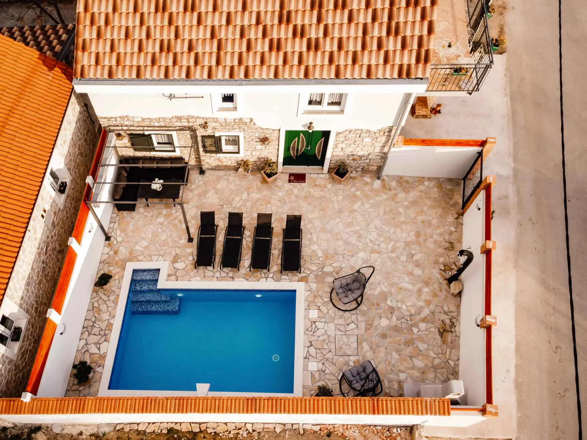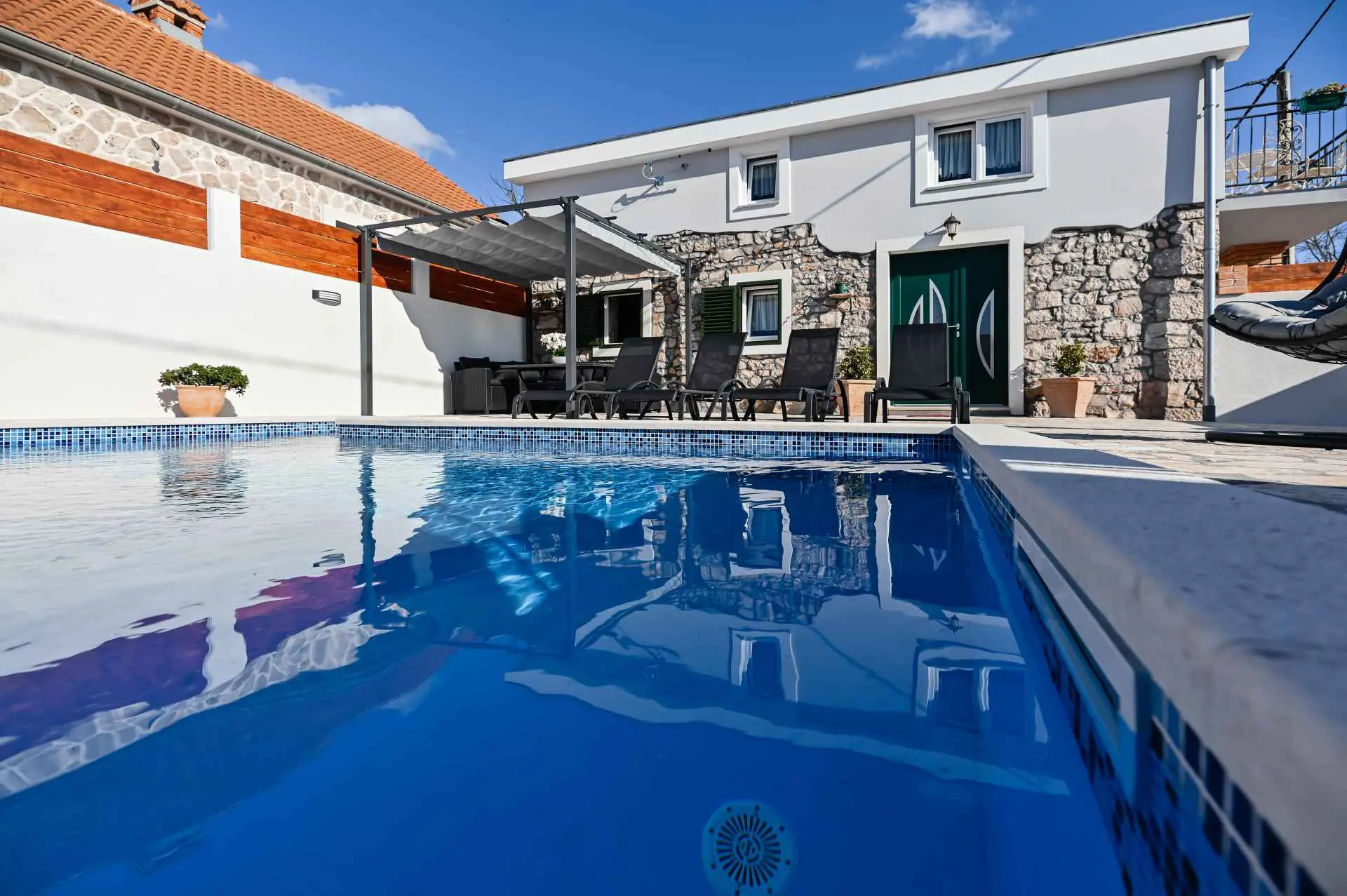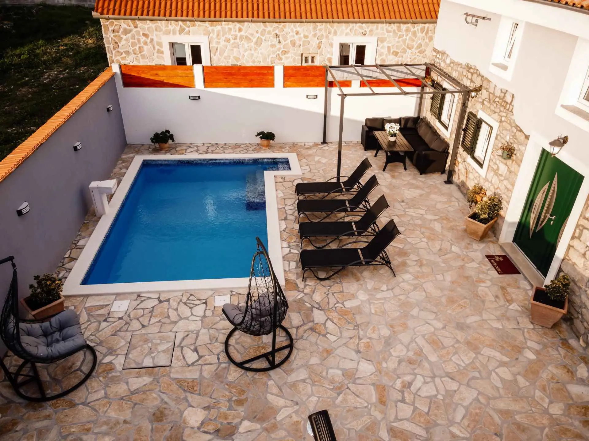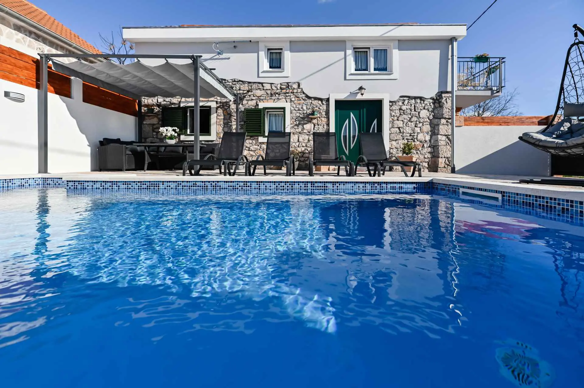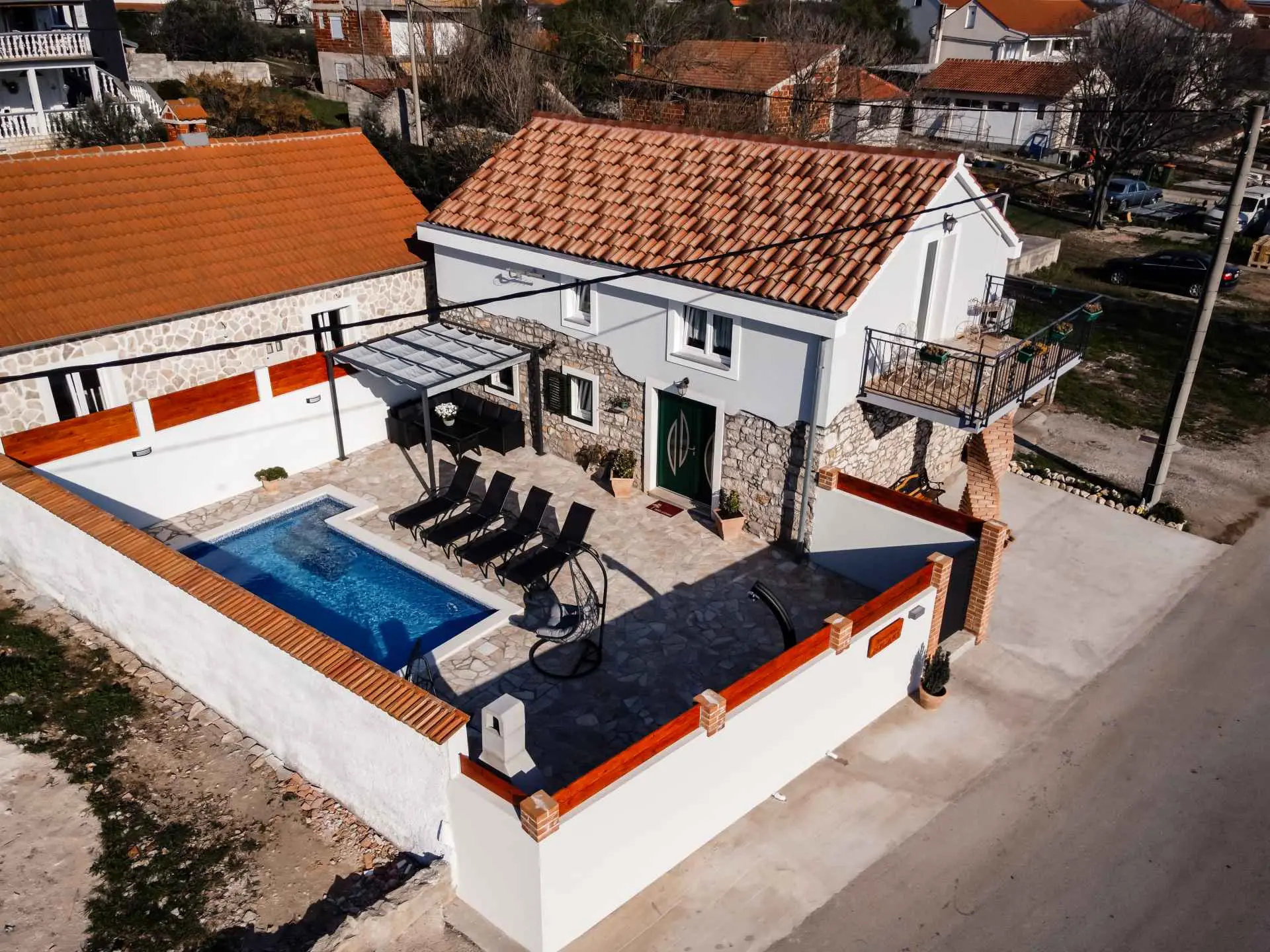 Dom wakacyjny "La felicità" znajduje się w głębi Zadaru, w małej i spokojnej miejscowości Zemunik Gornji. Może pomieścić 6 osób i oferuje odkryty basen z fontanną, leżakami i wygodnymi wiszącymi fotelami. Również taras słoneczny z pięknym widokiem, kominek, część wypoczynkowa i wiele więcej. Obiekt jest klimatyzowany i oferuje bezpłatny bezprzewodowy dostęp do Internetu oraz 2 bezpłatne miejsca parkingowe. Dom otoczony jest tradycyjnymi kamiennymi murami i zapewnia całkowitą prywatność. Dom zawiera w pełni wyposażoną kuchnię, salon, dwie łazienki, trzy sypialnie (2 łóżka podwójne i 2 łóżka pojedyncze), otwartą galerię... Gdzie będziesz: Zemunik Gornji to małe, ciche i bezpieczne miejsce w okolice Zadaru. 10 minut jazdy samochodem do najbliższej plaży (Sukošan) i 15 minut do Zadaru (odległość 18 km). Lotnisko Zemunik oddalone jest o 7 km, a dojazd zajmuje kilka minut. Możesz przypomnieć sobie parki naturalne, takie jak: Jezioro Telašćica i Vrana oraz parki narodowe: Jeziora Plitwickie, Krka, Kornati i Velebit (Paklenica). Kanion Zrmanja oferuje rafting. Można znaleźć więcej pięknych plaż (Bibinje, Petrčane, Zadar, Novigrad), restauracji, muzeów, katedr i parków. Jesteśmy dostępni na wszystkie pytania.