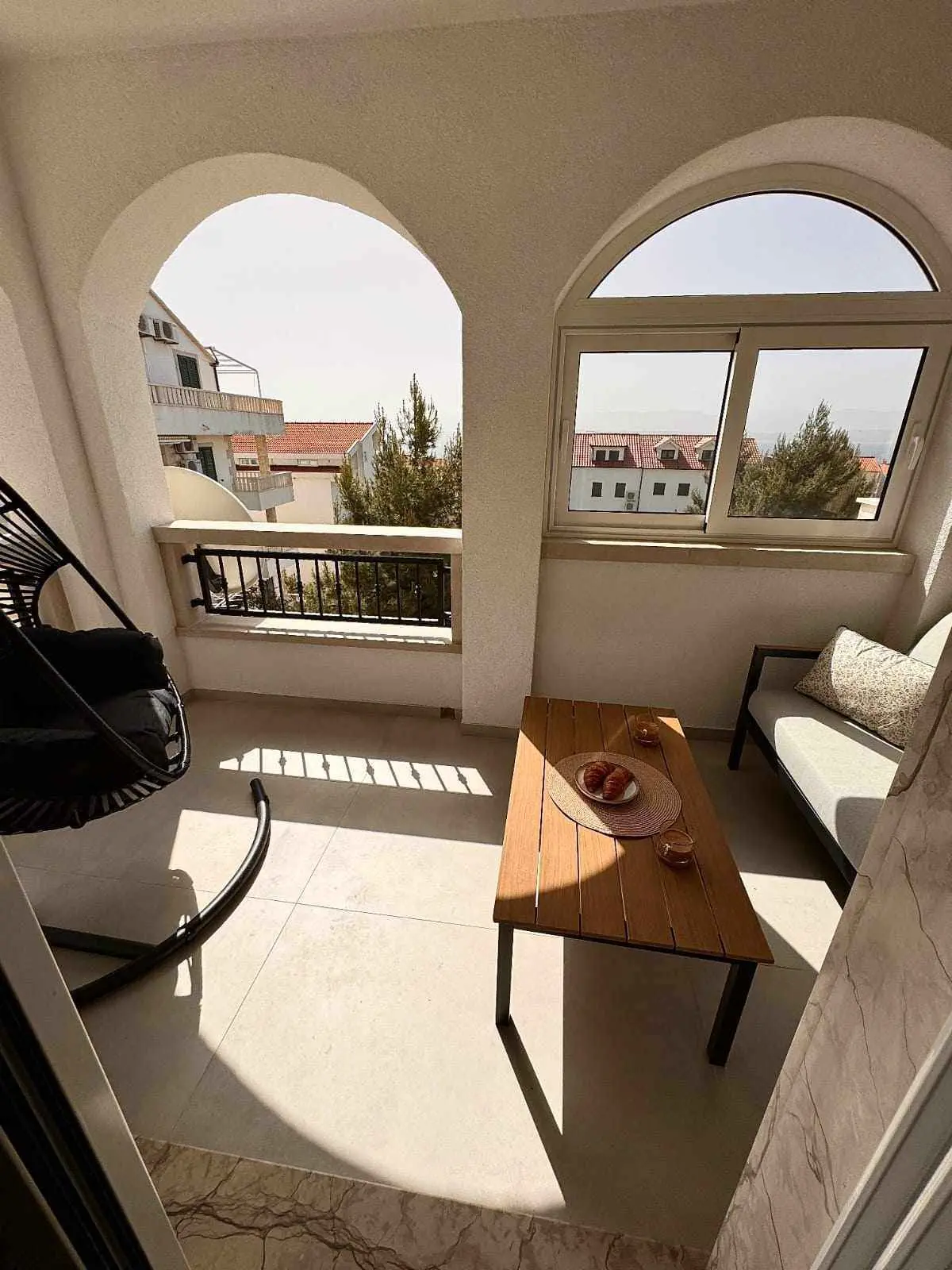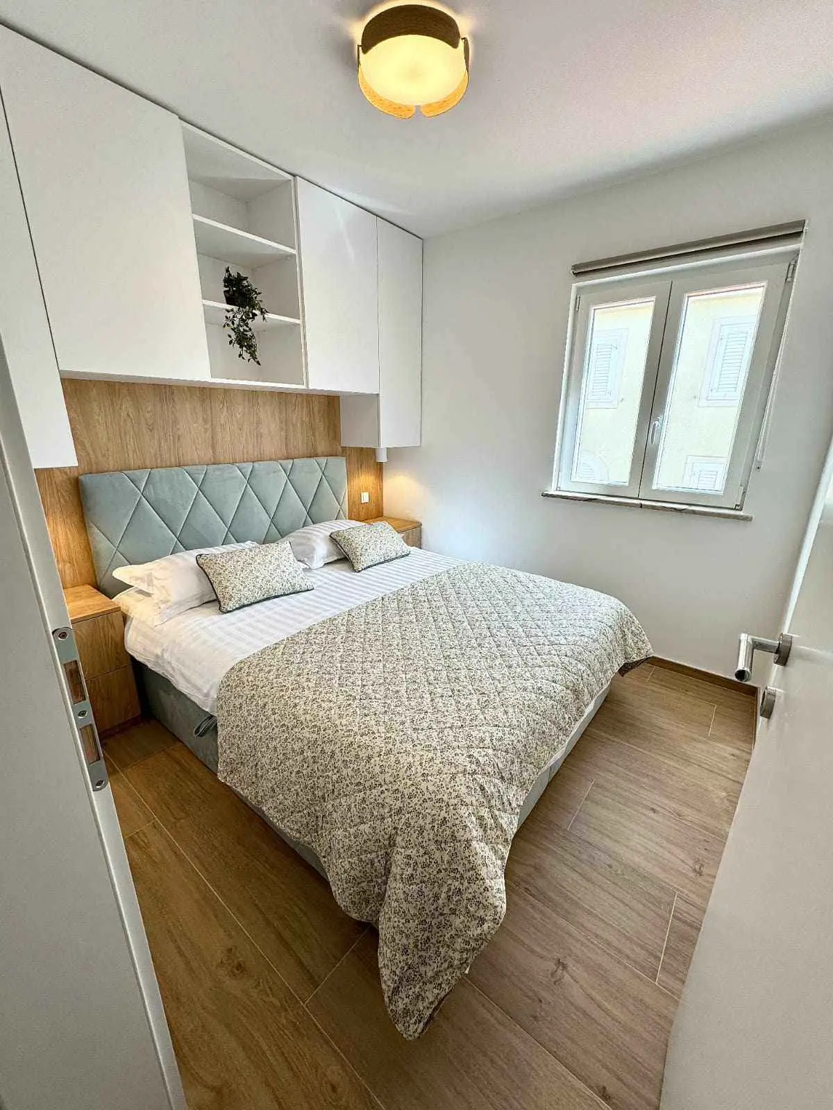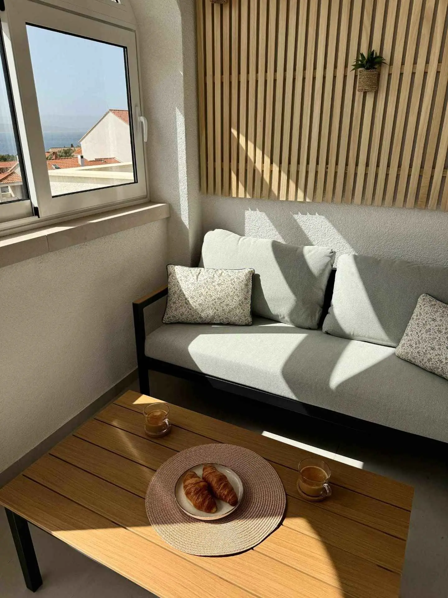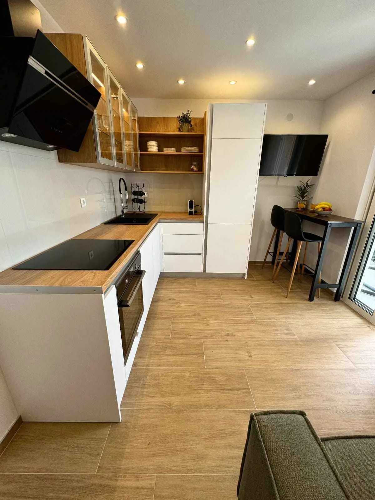 Lyxutrustad lägenhet med ett sovrum på första våningen med terrass med utsikt över havet. Lägenheten har ett sovrum med dubbelsäng, kök med matsal, badrum och terrass (8 m2). Lägenheten är modern och nyutrustad, luftkonditionerad och har satellit - TV, trådlöst internet. Bra läge, fem minuters gångavstånd till centrum och fem minuters gångavstånd till de första stränderna. Vi ser fram emot att välkomna dig!