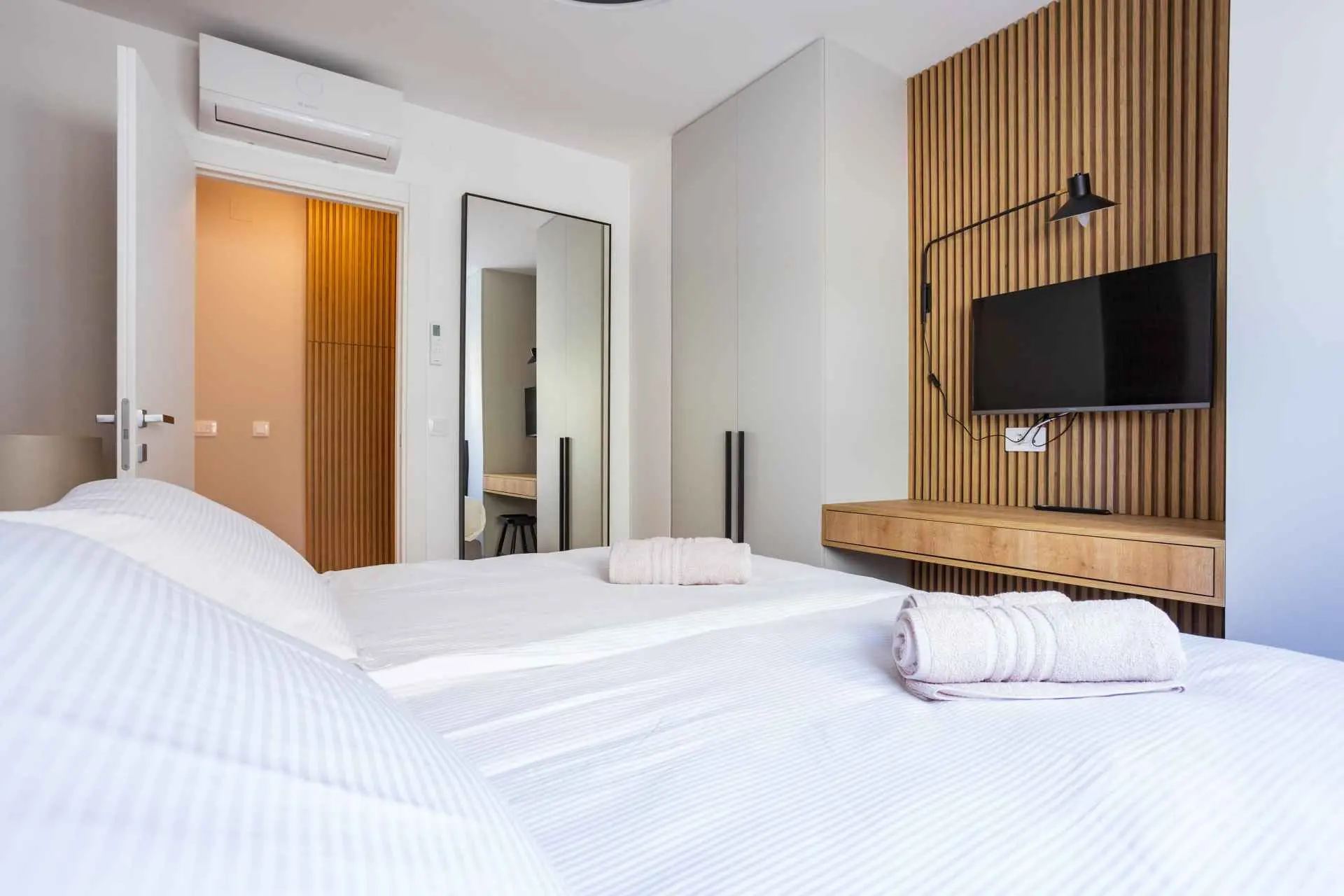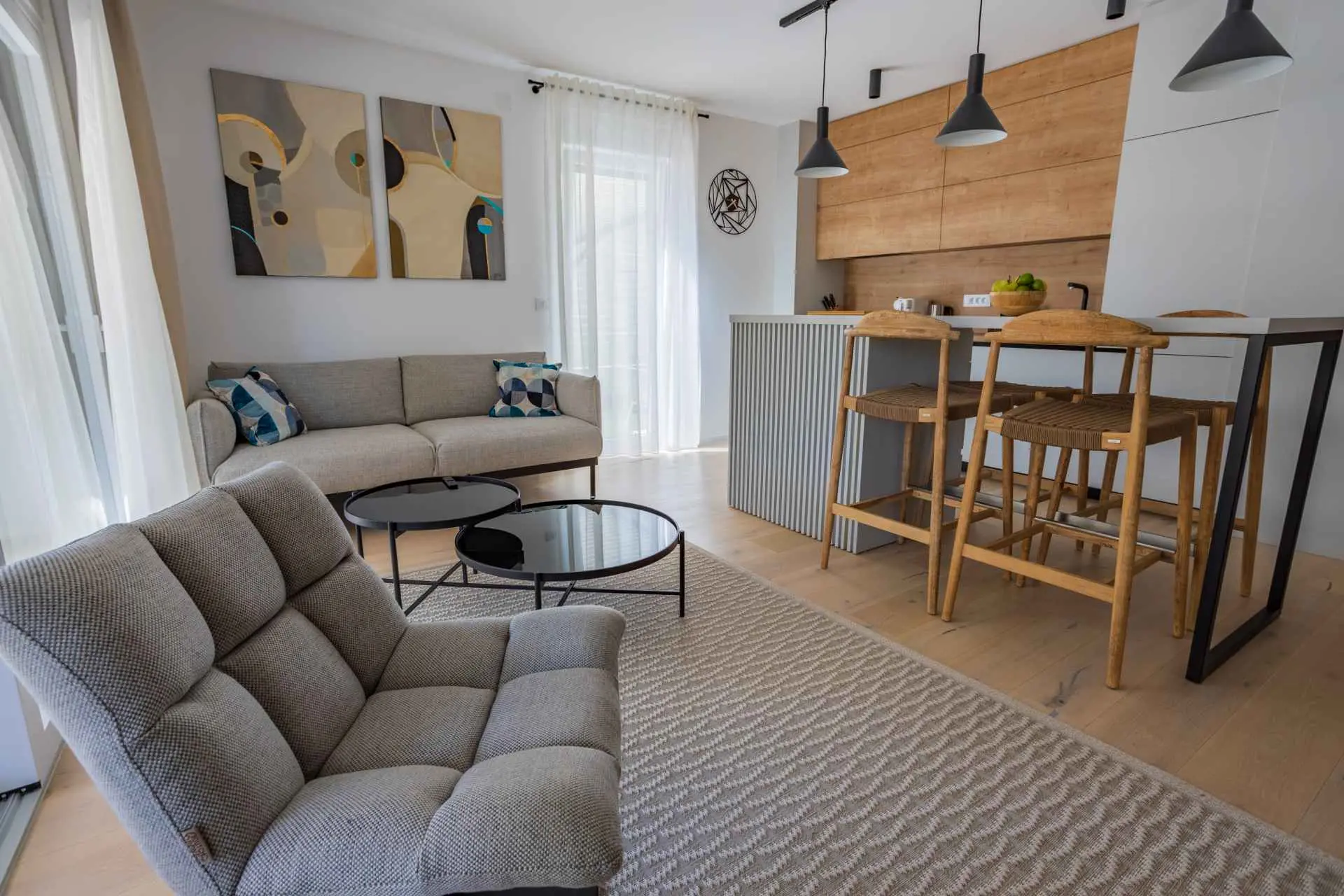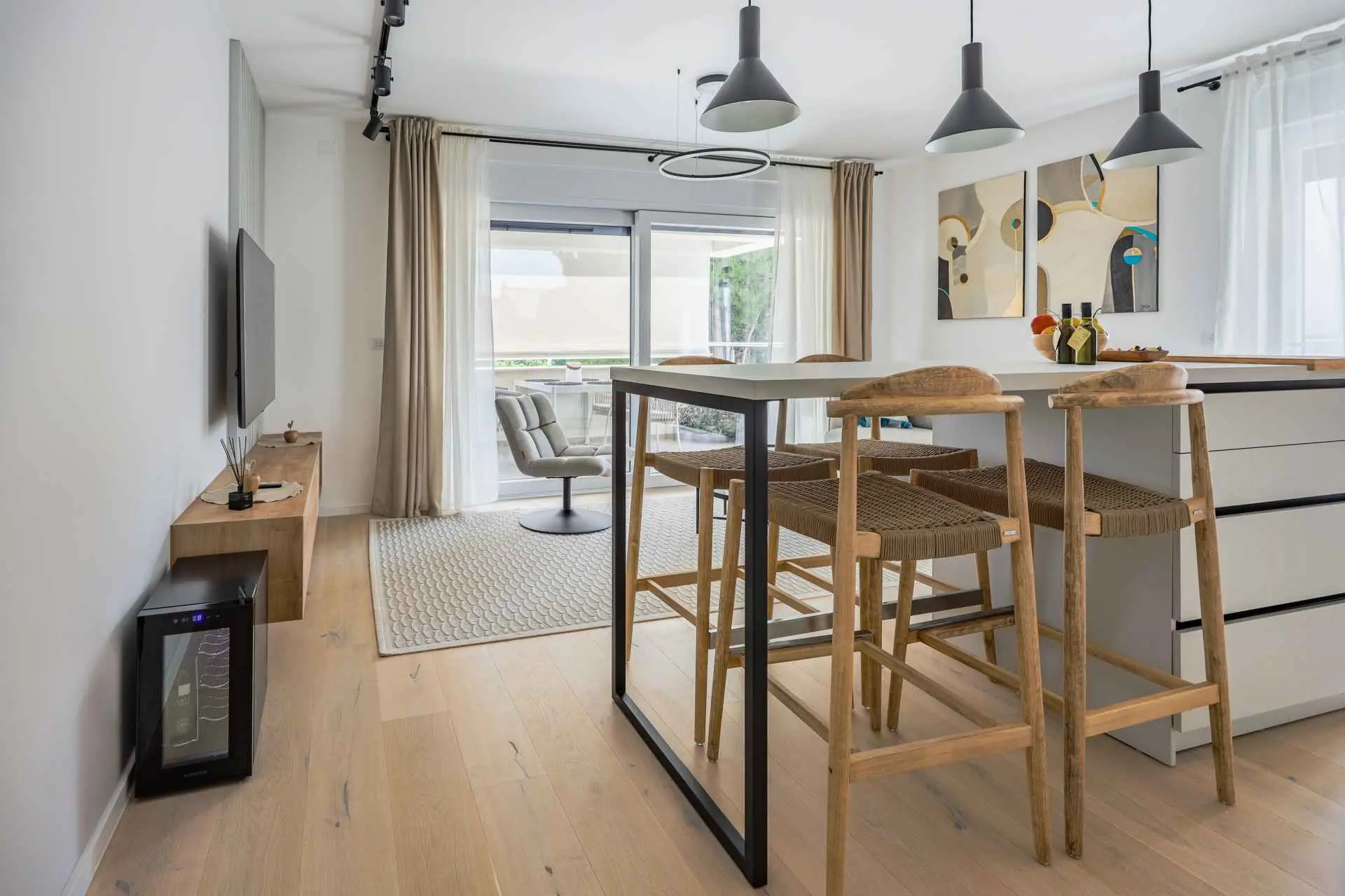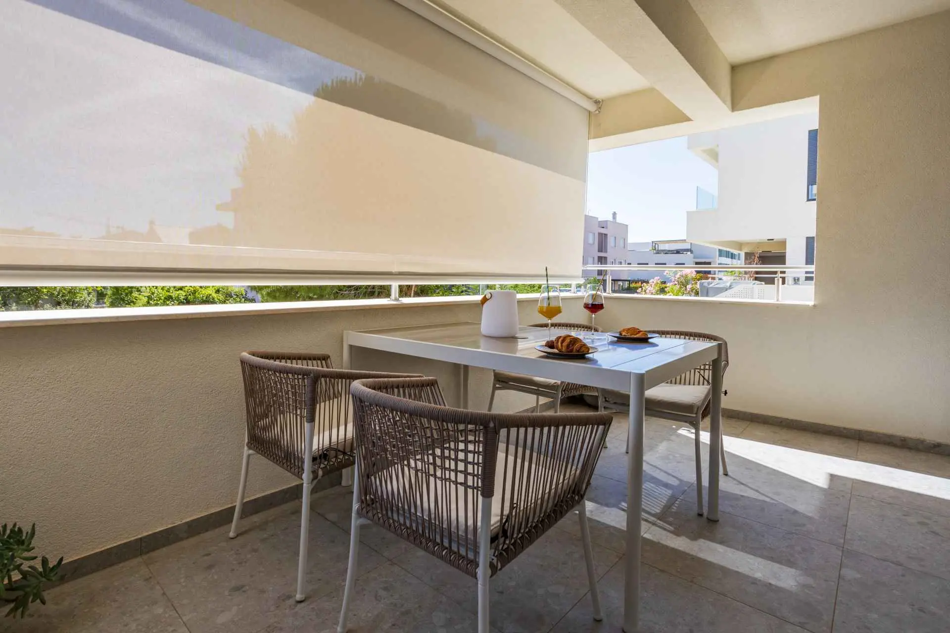 Lägenheten består av två sovrum med värdeskåp, badrum, toalett, vardagsrum med kök. Varje rum har en smart-TV. Boendet har en 30m2 trädgård med konstgräs och trädgårdsmöbler. Den har en 12m2 balkong med en elektrisk grill. Boendet innehåller två parkeringsplatser, utomhus och underjordiskt garage med rullport. Boendet har tvättmaskin med torktumlare, hårtork, diskmaskin, kaffebryggare, brödrost, smoothiemixer, vattenkokare, elektrisk citrussil, köksvåg, stavmixer och vinkyl. Internethastighet Gbit/s tillgänglig i alla rum. Avståndet till den första stranden, butiker, restauranger och cafébarer är cirka 200 meter. Lägenheten har en spjälsäng och en matare. RABATT! - efter personnummer - per vecka/månad bokning