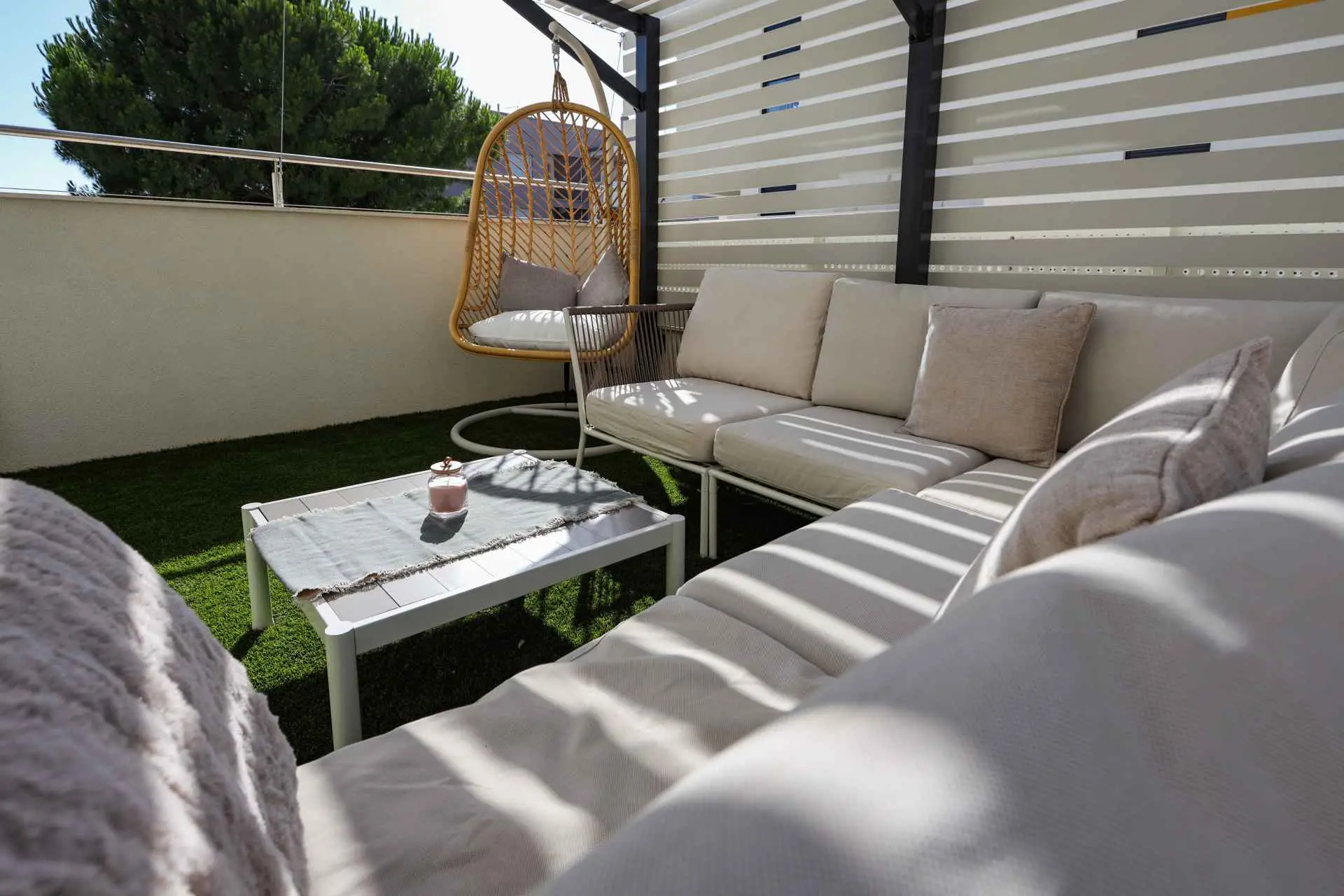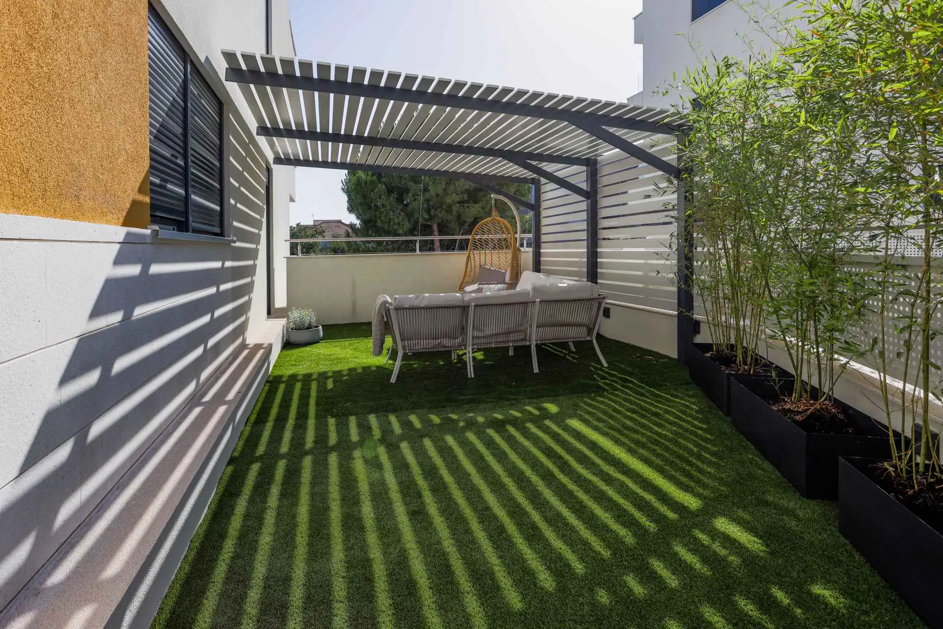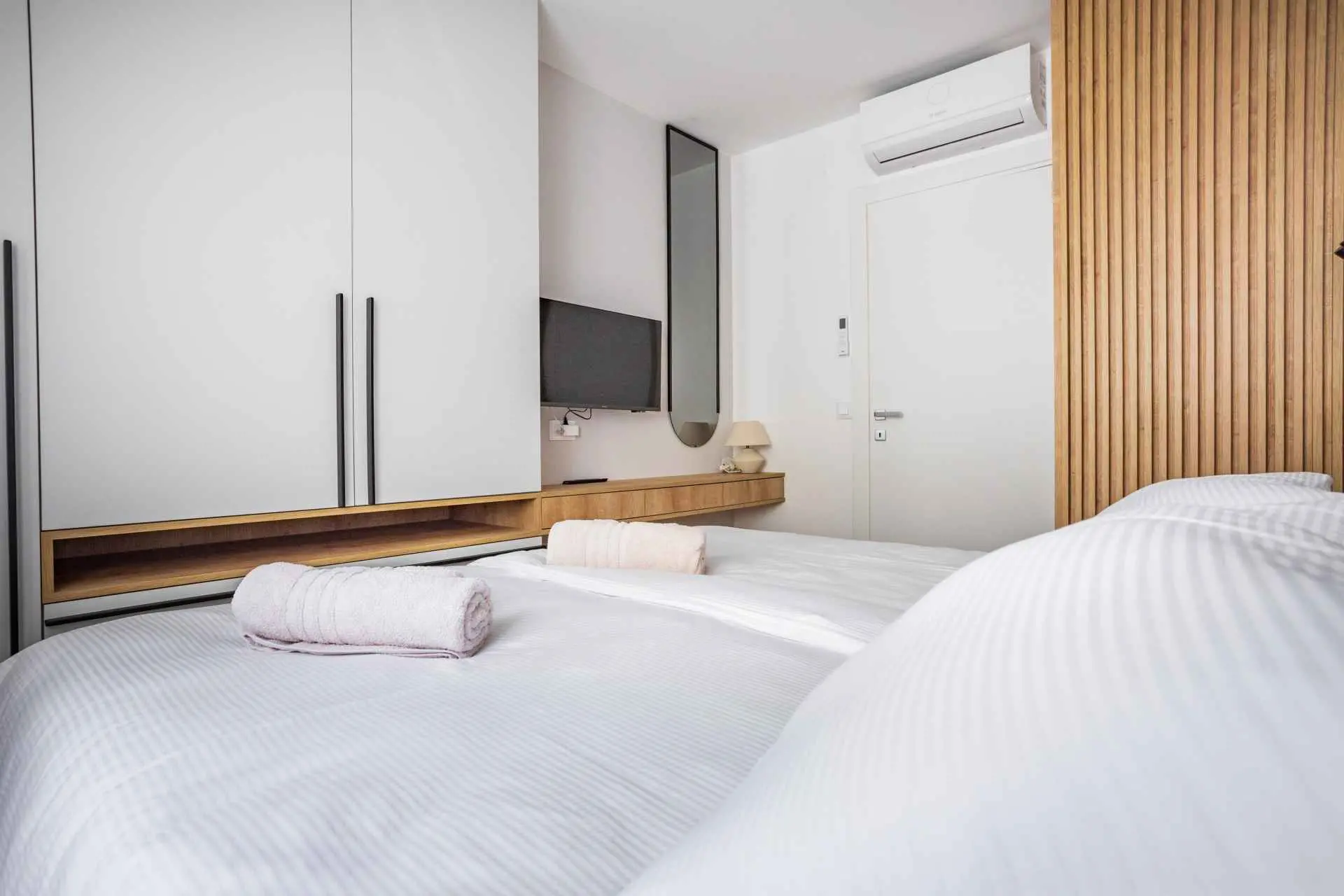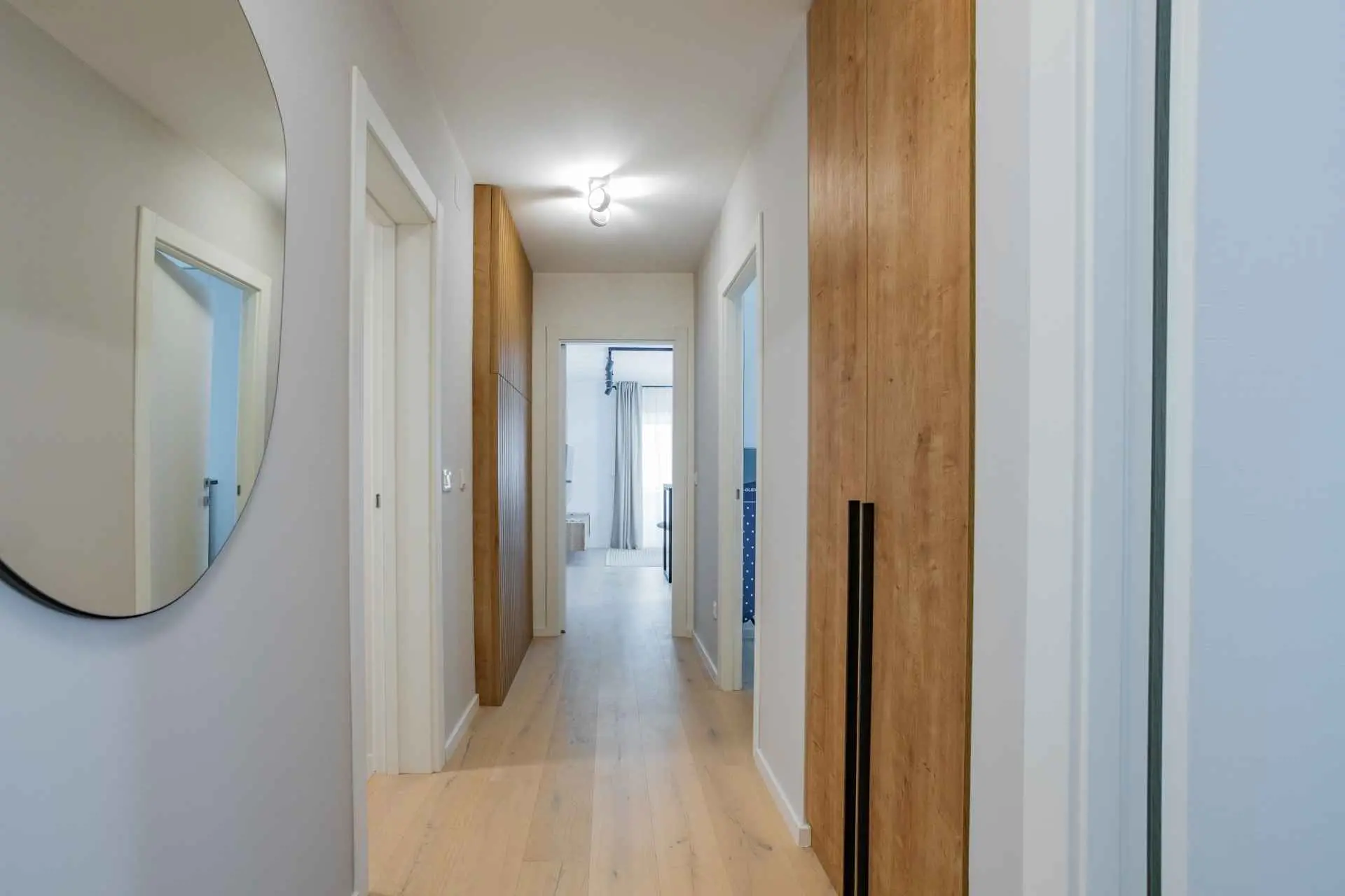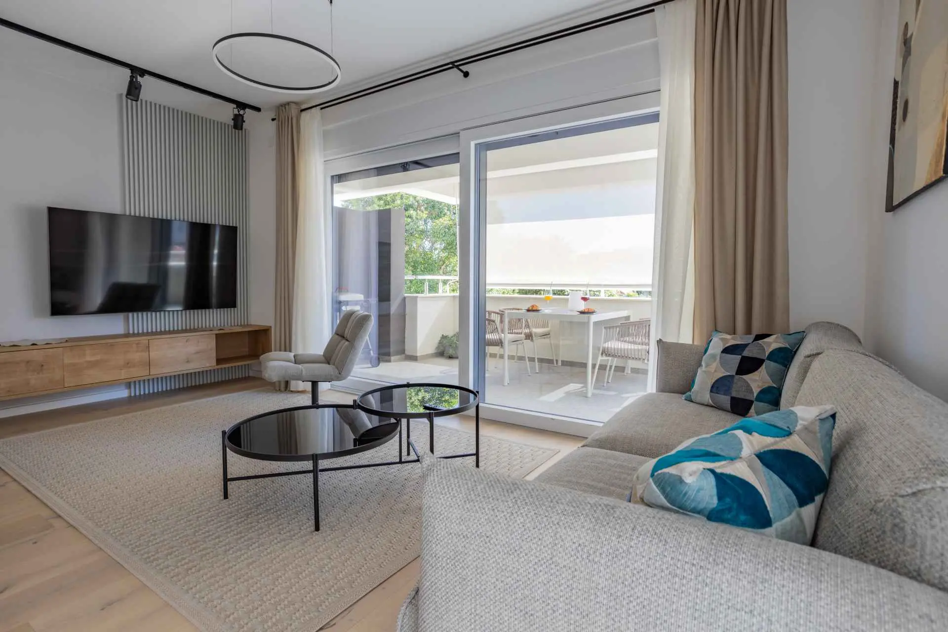 Lägenheten består av två sovrum med värdeskåp, badrum, toalett, vardagsrum med kök. Varje rum har en smart-TV. Boendet har en 30m2 trädgård med konstgräs och trädgårdsmöbler. Den har en 12m2 balkong med en elektrisk grill. Boendet innehåller två parkeringsplatser, utomhus och underjordiskt garage med rullport. Boendet har tvättmaskin med torktumlare, hårtork, diskmaskin, kaffebryggare, brödrost, smoothiemixer, vattenkokare, elektrisk citrussil, köksvåg, stavmixer och vinkyl. Internethastighet Gbit/s tillgänglig i alla rum. Avståndet till den första stranden, butiker, restauranger och cafébarer är cirka 200 meter. Lägenheten har en spjälsäng och en matare. RABATT! - efter personnummer - per vecka/månad bokning