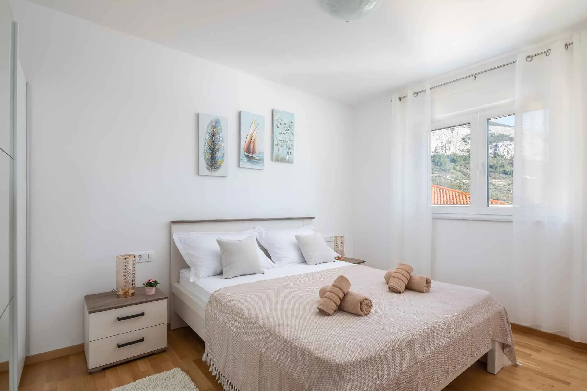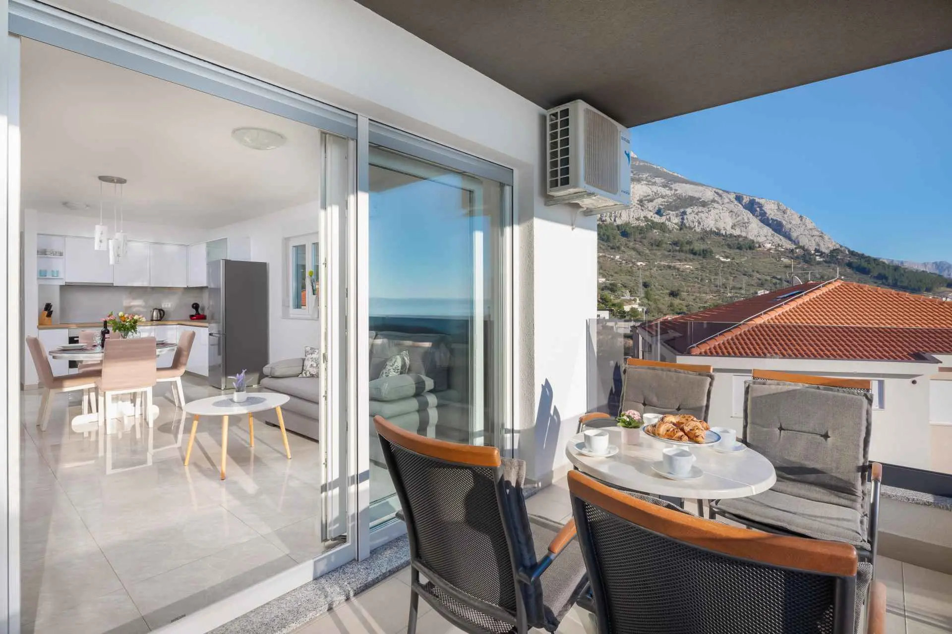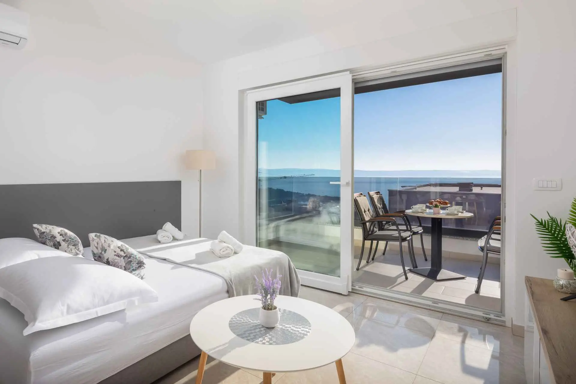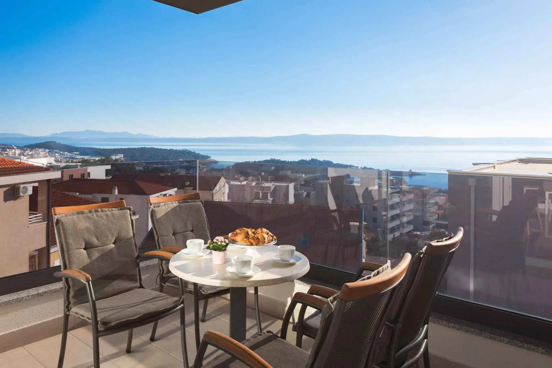 Luksuzni penthouse Big Blue v Tučepih ponuja neskončen pogled na modrino že iz prve vrste. Uživali boste lahko v jutranjem soncu in večernih sončnih zahodih. To moderno stanovanje je sestavljeno iz spalnice, kuhinje, kopalnice, dnevne sobe z raztegljivim kavčem in balkona z jacuzzijem. Parkirišče, internet in klima so vključeni v ponudbo. Izberite Tučepe za svoj dopust!