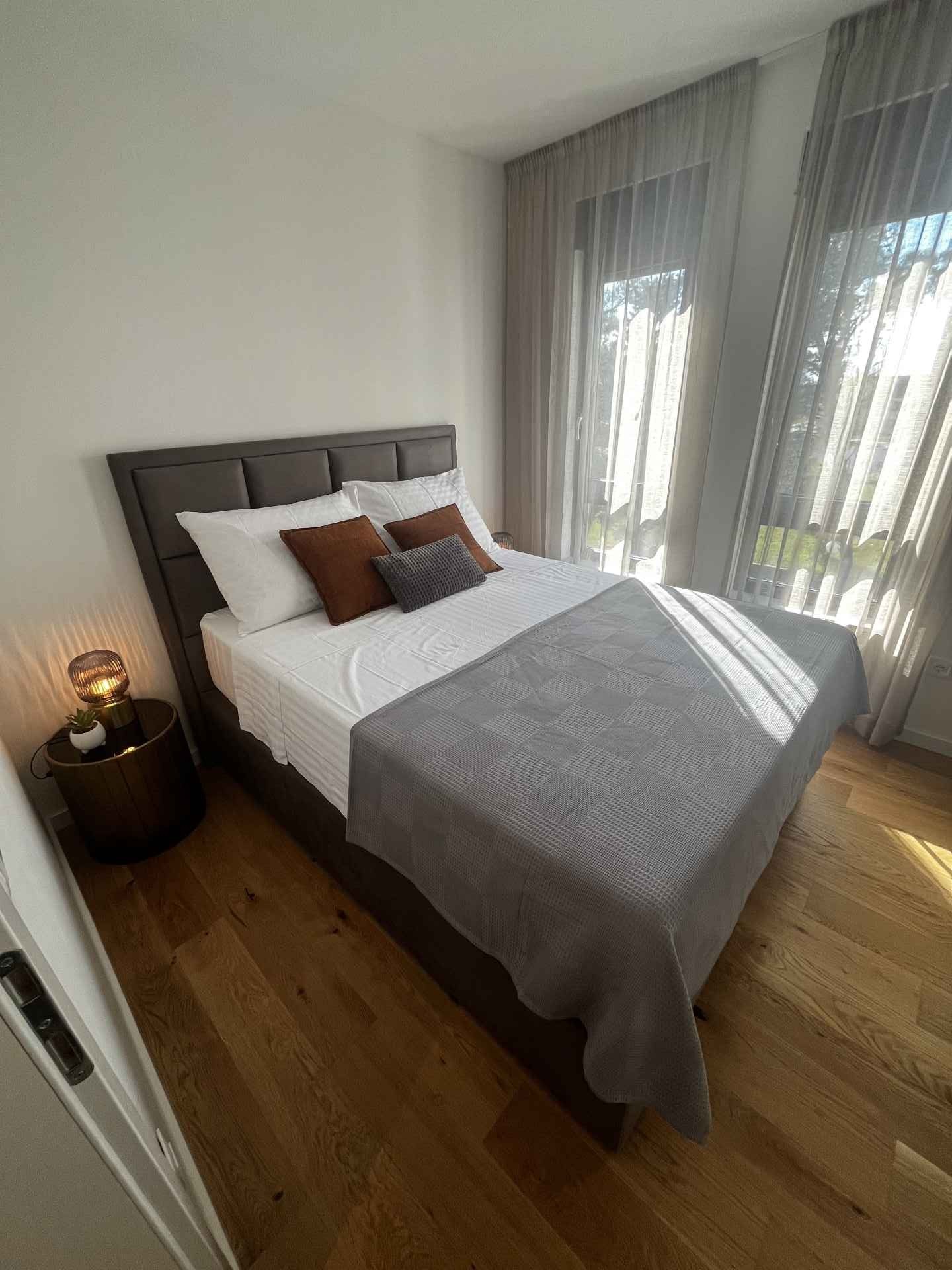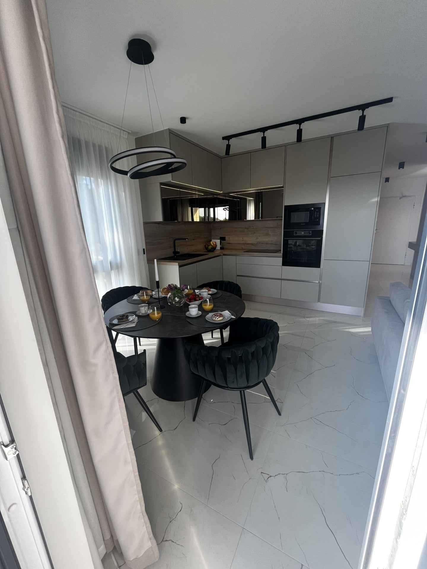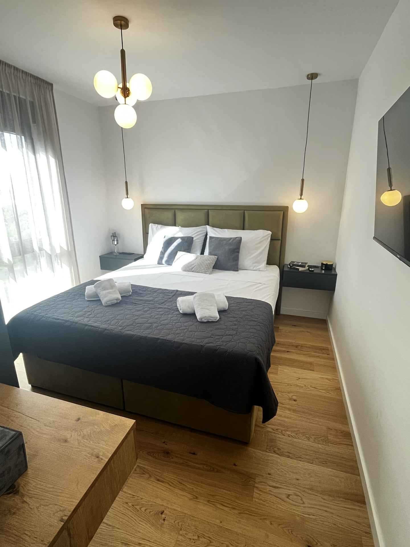 Novo prenovljeno luksuzno stanovanje 2+2. Stanovanje je sestavljeno iz 2 spalnic z zakonskimi posteljami. Vsaka soba ima klimatsko napravo in TV. Kopalnica in majhno stranišče za goste vsebujeta pralni stroj. Popolnoma opremljena kuhinja z vsemi potrebnimi aparati. Nahaja se v 2. nadstropju stanovanjske stavbe s čudovitim razgledom s terase. Zagotovljeno parkirno mesto.